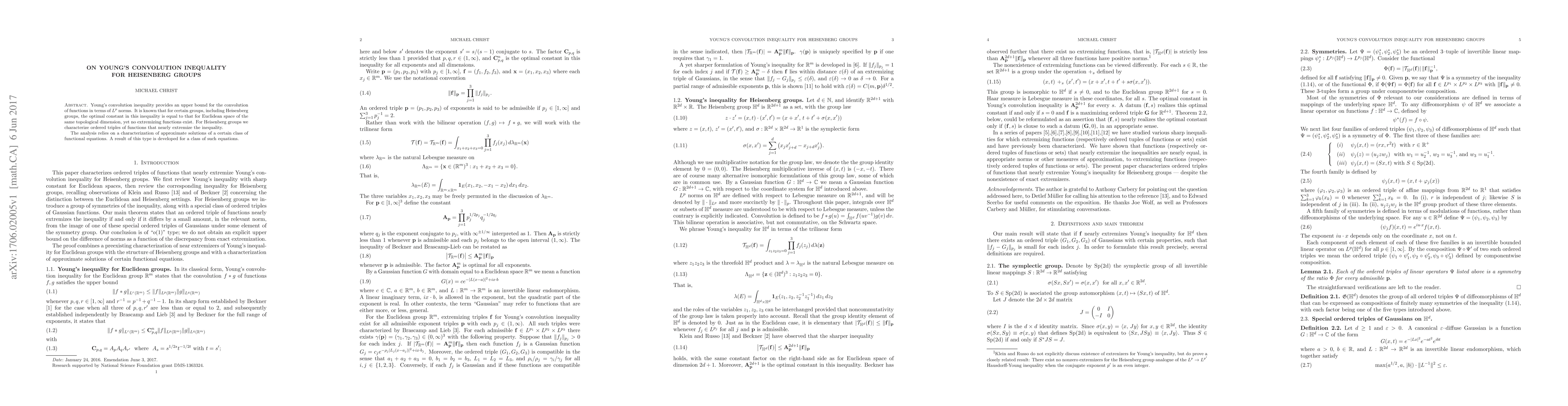 This paper investigates Young's inequality for convolution on Heisenberg groups, showing that the optimal constant matches that for Euclidean space, though no extremizing functions exist. The authors characterize ordered triples of functions that nearly achieve the inequality, using a novel analysis of approximate solutions to functional equations.