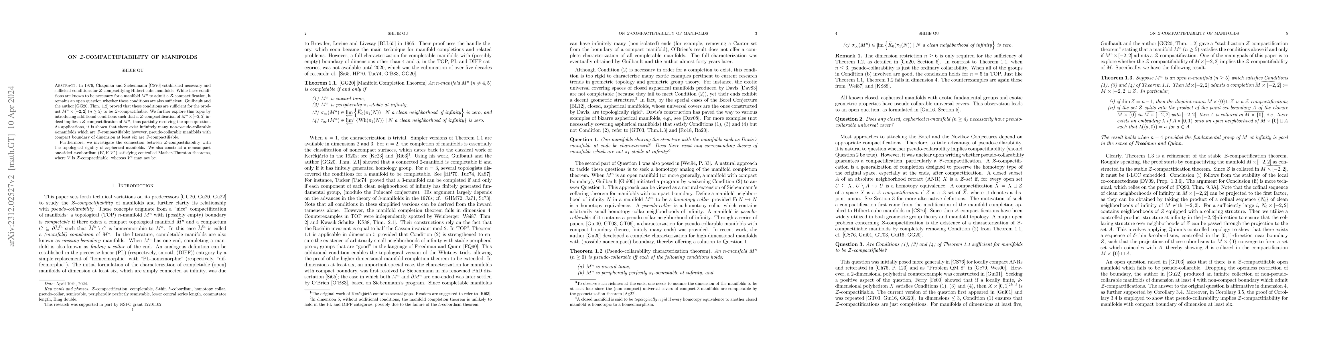 The paper explores the $\mathcal{Z}$-compactifiability of manifolds, confirming sufficiency of conditions for the $\mathcal{Z}$-compactification of certain products, and introduces additional criteria for $\mathcal{Z}$-compactification of $M^n$. It also finds infinitely many non-pseudo-collarable 4-manifolds that are $\mathcal{Z}$-compactifiable and studies the relationship between $\mathcal{Z}$-compactifiability and topological rigidity of aspherical manifolds.