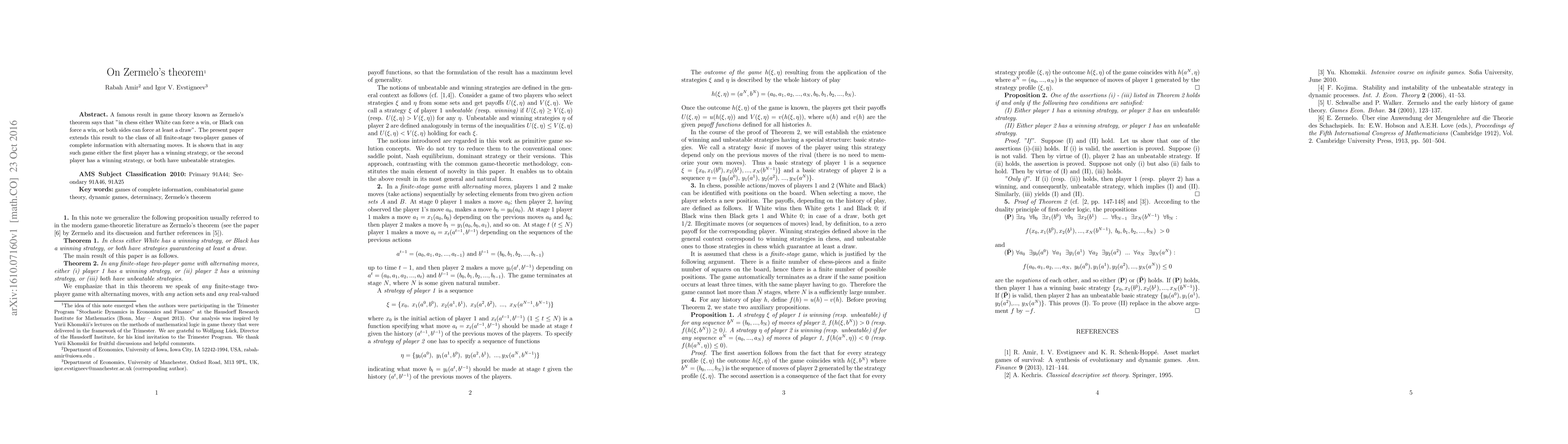 Zermelo's theorem is extended to all finite-stage two-player games with complete information, proving that in any such game, either the first player, the second player, or both have unbeatable strategies. This generalizes the original theorem from chess to a broader class of games.