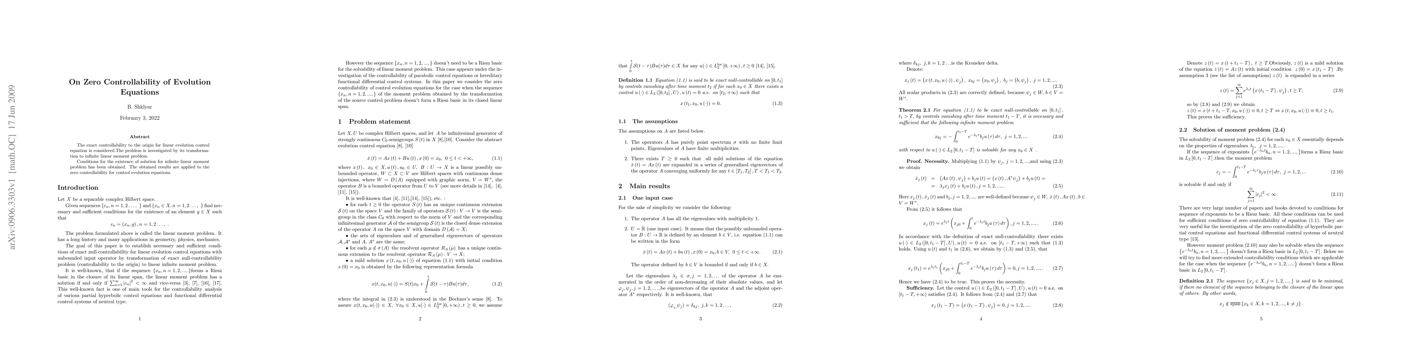 This paper investigates the exact controllability of linear evolution control equations by transforming the problem into an infinite linear moment problem, establishing conditions for solution existence, and applying these findings to determine zero controllability for control evolution equations.