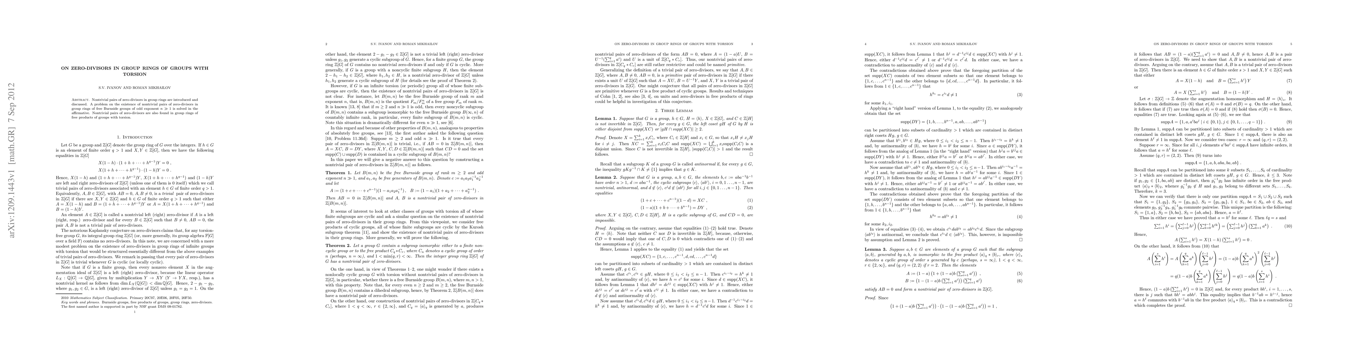 Nontrivial pairs of zero-divisors in group rings are introduced and discussed. A problem on the existence of nontrivial pairs of zero-divisors in group rings of free Burnside groups of odd exponent $n \gg 1$ is solved in the affirmative. Nontrivial pairs of zero-divisors are also found in group rings of free products of groups with torsion.