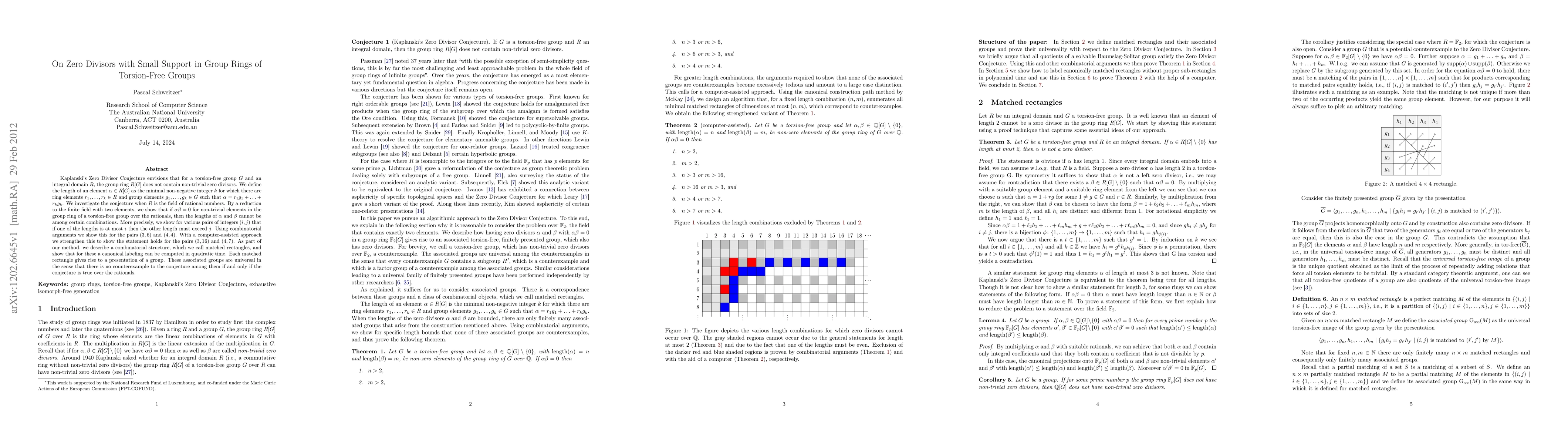 Kaplanski's Zero Divisor Conjecture envisions that for a torsion-free group G and an integral domain R, the group ring R[G] does not contain non-trivial zero divisors. We define the length of an element a in R[G] as the minimal non-negative integer k for which there are ring elements r_1,...,r_k in R and group elements g_1,...,g_k in G such that a = r_1 g_1+...+r_k g_k. We investigate the conjecture when R is the field of rational numbers. By a reduction to the finite field with two elements, we show that if ab = 0 for non-trivial elements in the group ring of a torsion-free group over the rationals, then the lengths of a and b cannot be among certain combinations. More precisely, we show for various pairs of integers (i,j) that if one of the lengths is at most i then the other length must exceed j. Using combinatorial arguments we show this for the pairs (3,6) and (4,4). With a computer-assisted approach we strengthen this to show the statement holds for the pairs (3,16) and (4,7). As part of our method, we describe a combinatorial structure, which we call matched rectangles, and show that for these a canonical labeling can be computed in quadratic time. Each matched rectangle gives rise to a presentation of a group. These associated groups are universal in the sense that there is no counterexample to the conjecture among them if and only if the conjecture is true over the rationals.