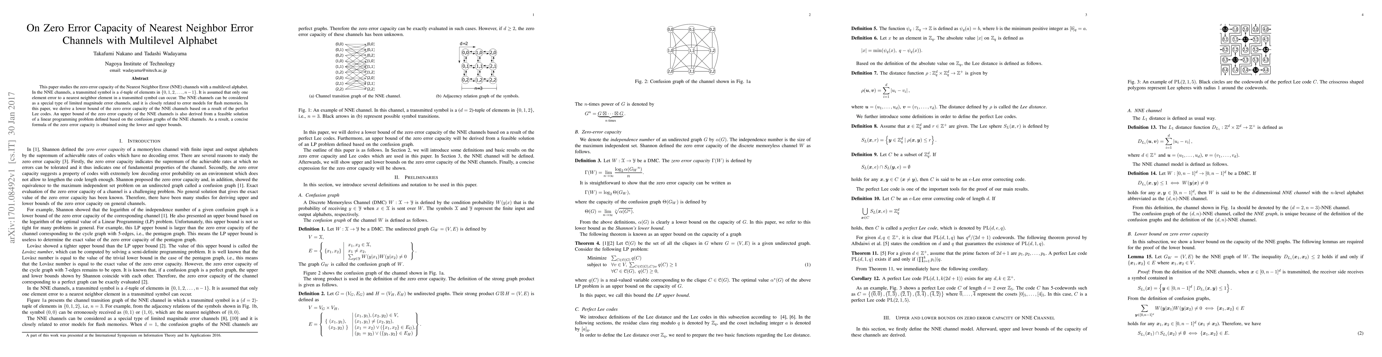 This paper investigates the zero error capacity of Nearest Neighbor Error channels with a multilevel alphabet, deriving both lower and upper bounds based on Lee codes and linear programming, respectively, to establish a concise formula for the zero error capacity.