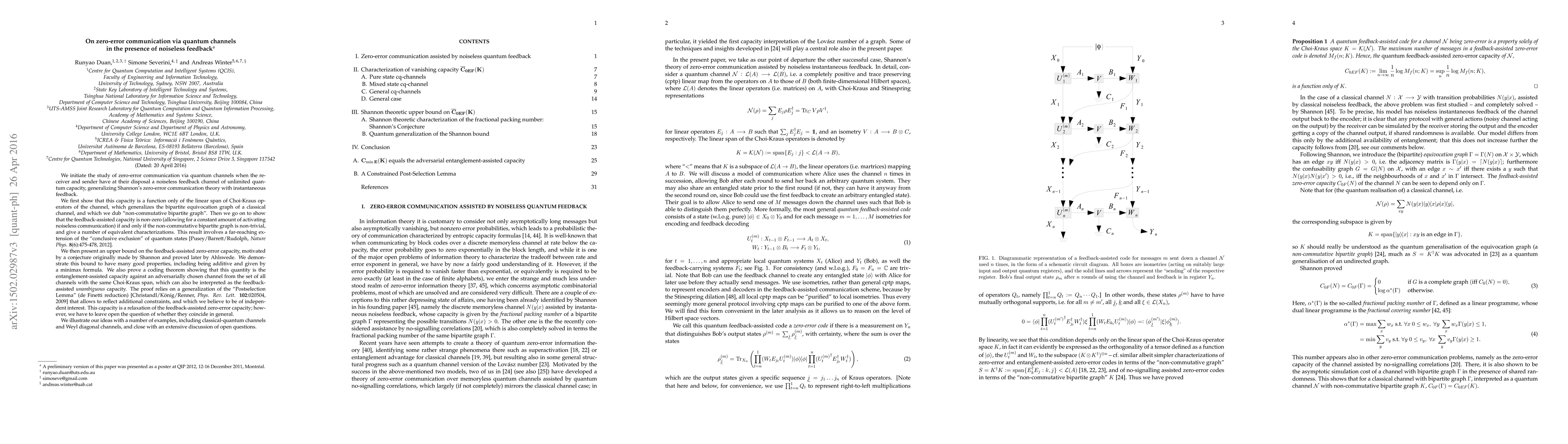 This paper explores zero-error communication via quantum channels with noiseless feedback, showing that the capacity depends on the "non-commutative bipartite graph" of the channel's Choi-Kraus operators. It proves that feedback-assisted zero-error capacity is non-zero if this graph is non-trivial, and provides an upper bound on this capacity with desirable properties.