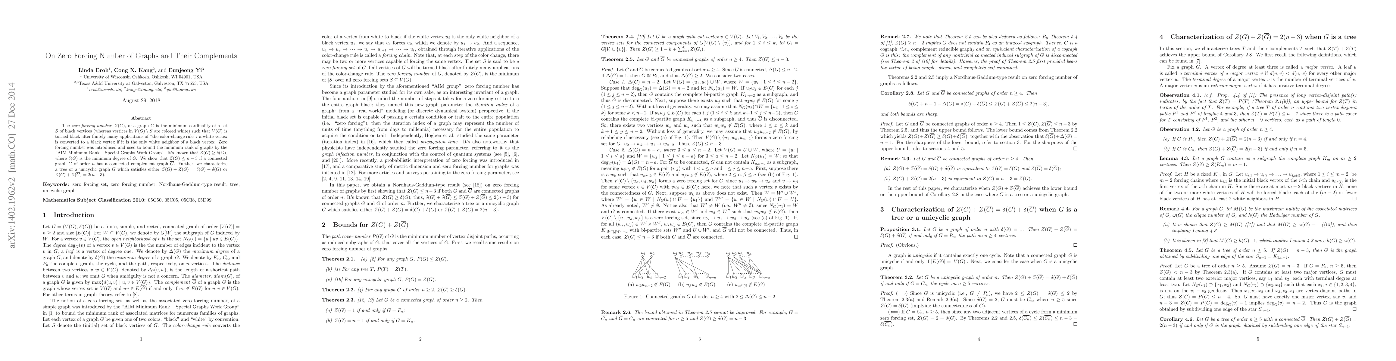 This paper explores the zero forcing number $Z(G)$ of graphs and their complements, demonstrating that $Z(G) \leq n-3$ for connected graphs $G$ with connected complement $\overline{G}$. It also characterizes trees and unicyclic graphs where $Z(G) + Z(\overline{G})$ equals either $\delta(G) + \delta(\overline{G})$ or $2(n-3)$.