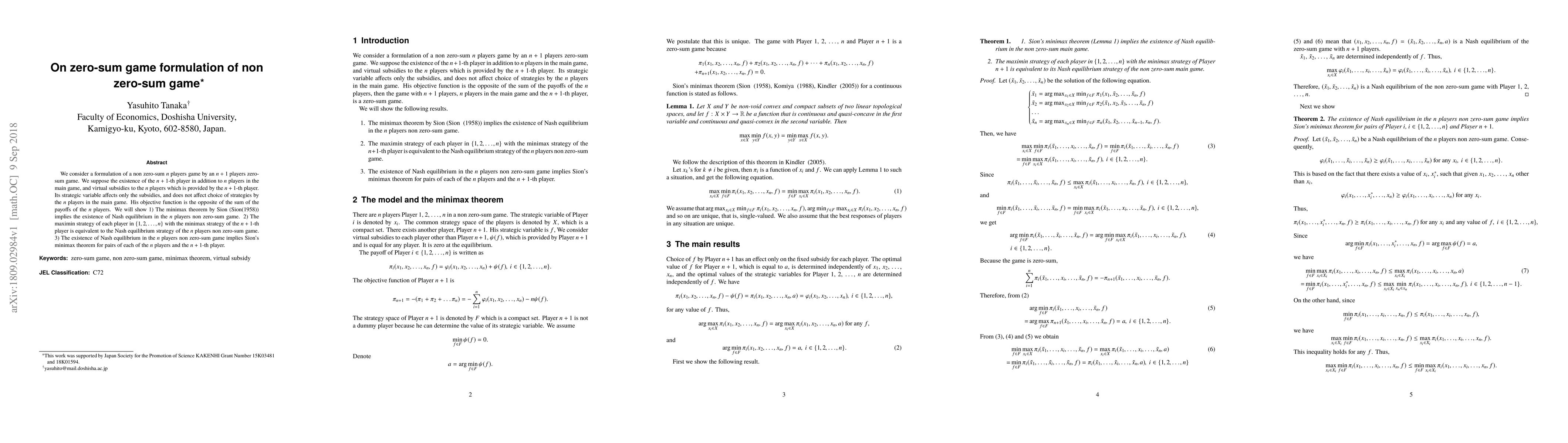 This paper formulates a non-zero-sum game involving n players as a zero-sum game with n+1 players, introducing a virtual n+1-th player who subsidizes the n players. It demonstrates the equivalence between Nash equilibrium in the non-zero-sum game and the minimax strategy in the zero-sum game, proving the existence of Nash equilibrium via Sion's minimax theorem.