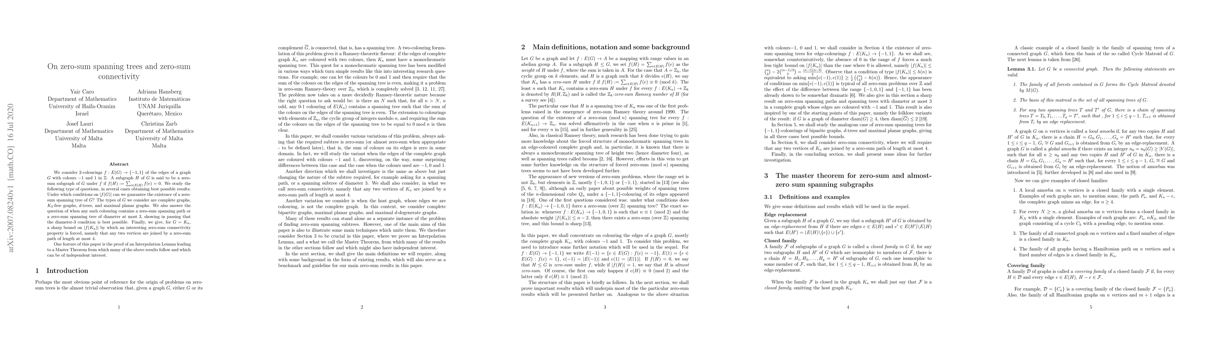 We consider $2$-colourings $f : E(G) \rightarrow \{ -1 ,1 \}$ of the edges of a graph $G$ with colours $-1$ and $1$ in $\mathbb{Z}$. A subgraph $H$ of $G$ is said to be a zero-sum subgraph of $G$ under $f$ if $f(H) := \sum_{e\in E(H)} f(e) =0$. We study the following type of questions, in several cases obtaining best possible results: Under which conditions on $|f(G)|$ can we guarantee the existence of a zero-sum spanning tree of $G$? The types of $G$ we consider are complete graphs, $K_3$-free graphs, $d$-trees, and maximal planar graphs. We also answer the question of when any such colouring contains a zero-sum spanning path or a zero-sum spanning tree of diameter at most $3$, showing in passing that the diameter-$3$ condition is best possible. Finally, we give, for $G = K_n$, a sharp bound on $|f(K_n)|$ by which an interesting zero-sum connectivity property is forced, namely that any two vertices are joined by a zero-sum path of length at most $4$. One feature of this paper is the proof of an Interpolation Lemma leading to a Master Theorem from which many of the above results follow and which can be of independent interest.