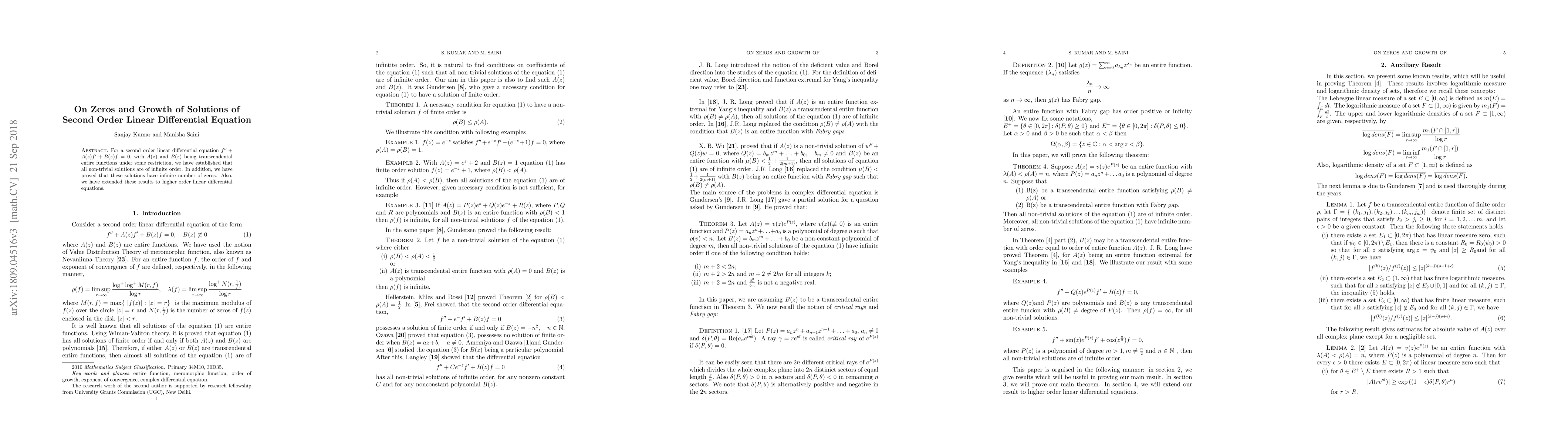 This paper establishes that non-trivial solutions to the second order linear differential equation $f''+A(z)f'+B(z)f=0$, where $A(z)$ and $B(z)$ are transcendental entire functions, possess infinite order and an infinite number of zeros. The findings are also extended to higher order linear differential equations.