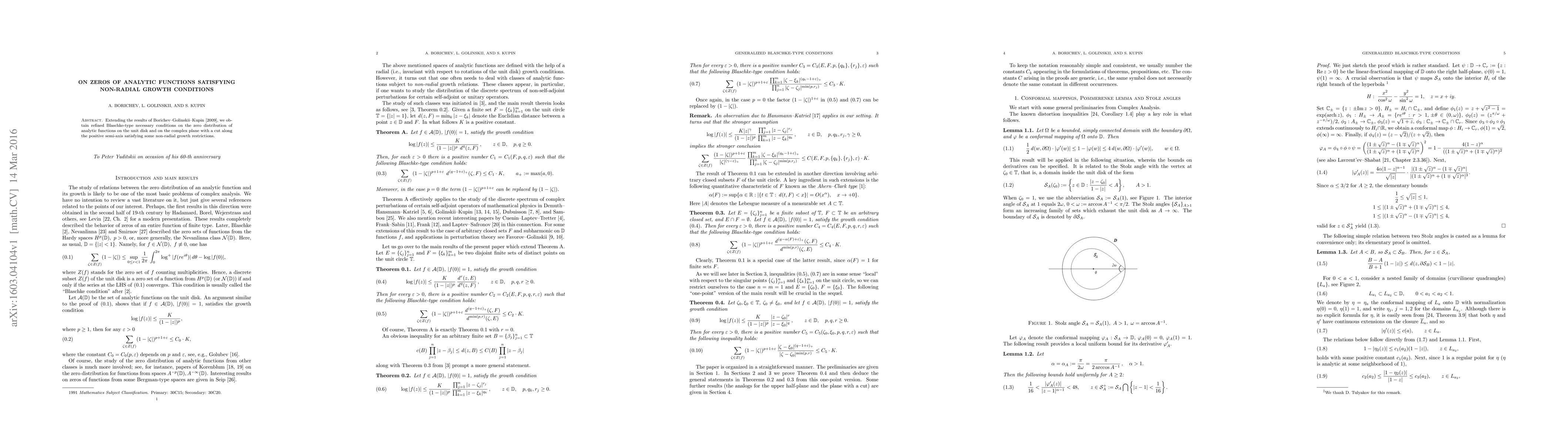This paper extends previous results to provide refined Blaschke-type conditions on the zero distribution of analytic functions in the unit disk and on the complex plane with a cut along the positive semi-axis, under non-radial growth restrictions.