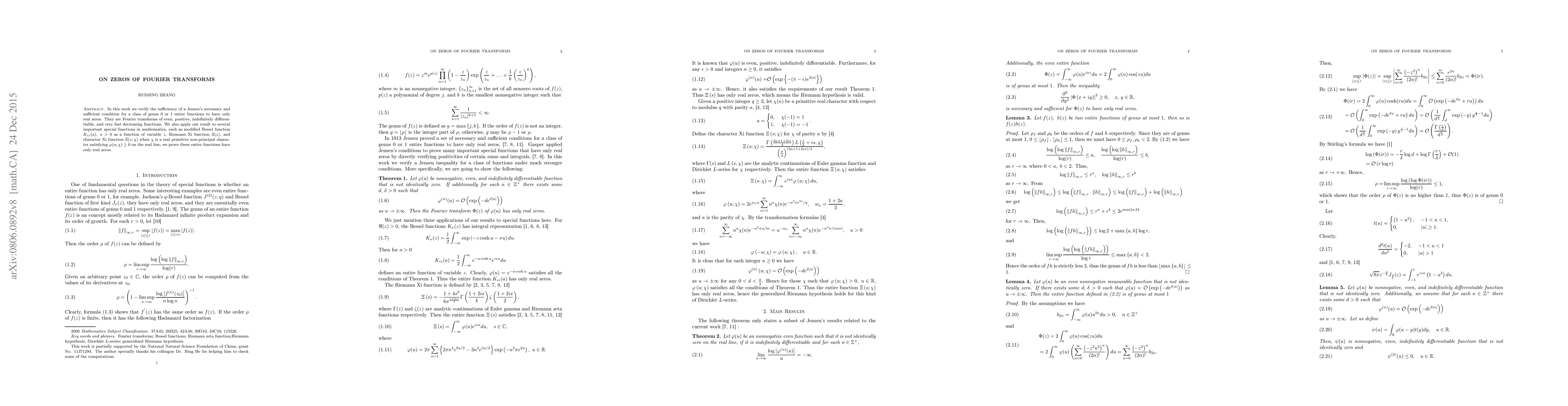 This paper verifies a Jensen's condition for entire functions of genus 0 or 1 to have only real zeros, showing it applies to Fourier transforms of specific even, positive, differentiable functions. The result is further demonstrated for special functions like the modified Bessel function, Riemann Xi function, and character Xi function.