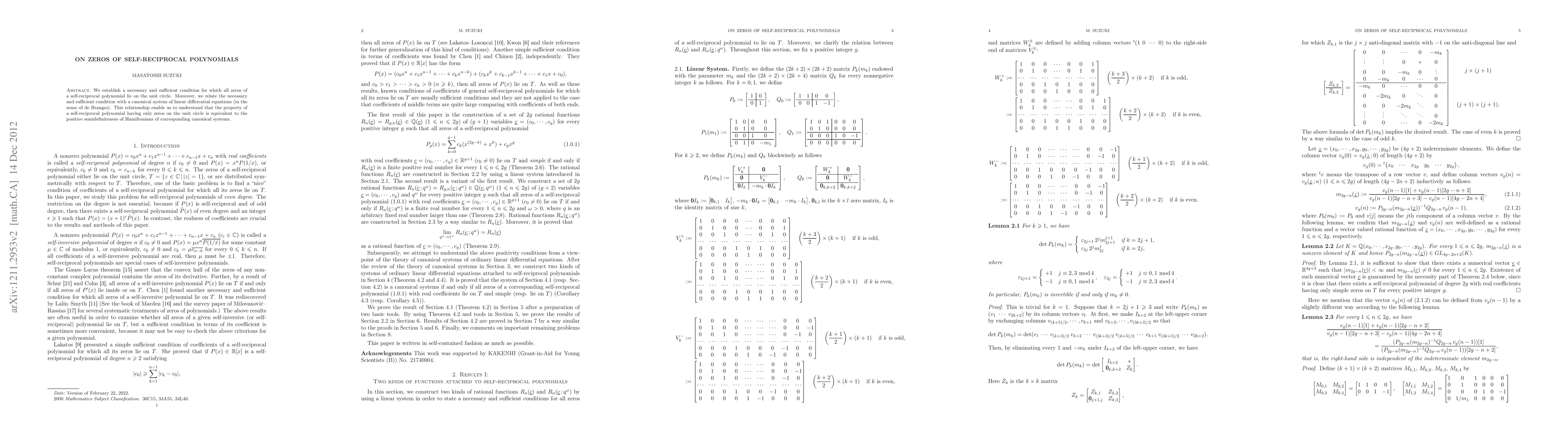 This paper presents a necessary and sufficient condition for all zeros of a self-reciprocal polynomial to reside on the unit circle, linking this property to the positive semidefiniteness of Hamiltonians in canonical linear differential equations.