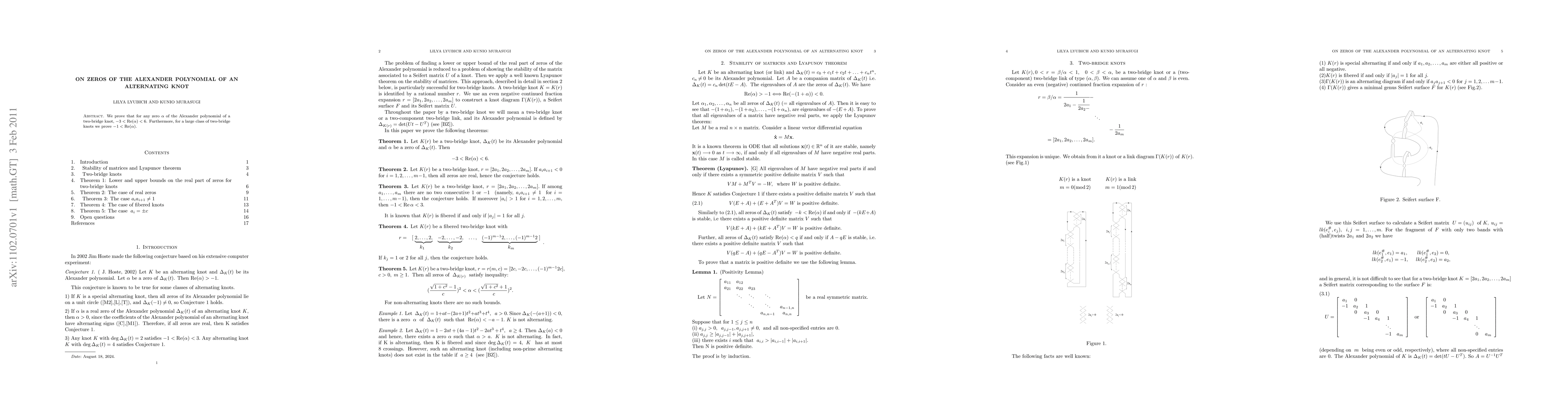 Researchers found that zeros of the Alexander polynomial for two-bridge knots have real parts between -3 and 6, with a subset having real parts between -1 and 6.
