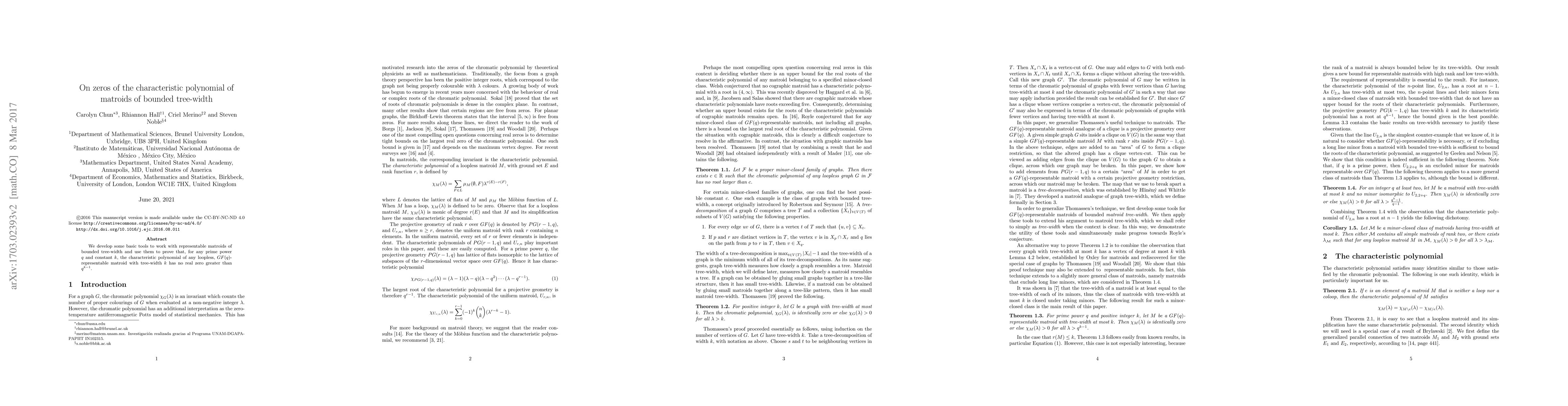 Summary: This paper introduces tools for analyzing representable matroids with bounded tree-width and demonstrates that the characteristic polynomial of any loopless, $GF(q)$-representable matroid with tree-width $k$ has no real zero exceeding $q^{k-1}$.