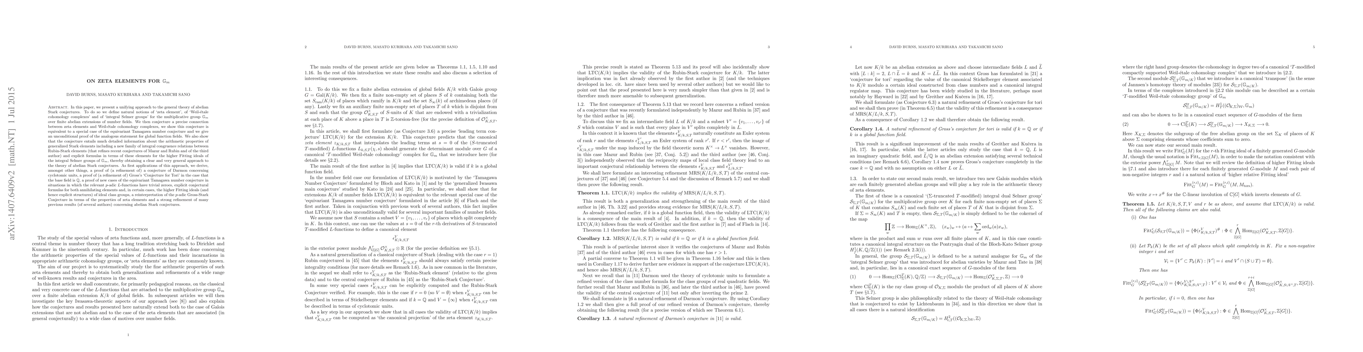 In this paper, we present a unifying approach to the general theory of abelian Stark conjectures. To do so we define natural notions of `zeta element', of `Weil-\'etale cohomology complexes' and of `integral Selmer groups' for the multiplicative group $\mathbb{G}_m$ over finite abelian extensions of number fields. We then conjecture a precise connection between zeta elements and Weil-\'etale cohomology complexes, we show this conjecture is equivalent to a special case of the equivariant Tamagawa number conjecture and we give an unconditional proof of the analogous statement for global function fields. We also show that the conjecture entails much detailed information about the arithmetic properties of generalized Stark elements including a new family of integral congruence relations between Rubin-Stark elements (that refines recent conjectures of Mazur and Rubin and of the third author) and explicit formulas in terms of these elements for the higher Fitting ideals of the integral Selmer groups of $\mathbb{G}_m$, thereby obtaining a clear and very general approach to the theory of abelian Stark conjectures. As first applications of this approach, we derive, amongst other things, a proof of (a refinement of) a conjecture of Darmon concerning cyclotomic units, a proof of (a refinement of) Gross's `Conjecture for Tori' in the case that the base field is $\mathbb{Q}$, a proof of new cases of the equivariant Tamagawa number conjecture in situations in which the relevant $p$-adic $L$-functions have trivial zeroes, explicit conjectural formulas for both annihilating elements and, in certain cases, the higher Fitting ideals (and hence explicit structures) of ideal class groups, a reinterpretation of the $p$-adic Gross-Stark Conjecture in terms of the properties of zeta elements and a strong refinement of many previous results (of several authors) concerning abelian Stark conjectures.