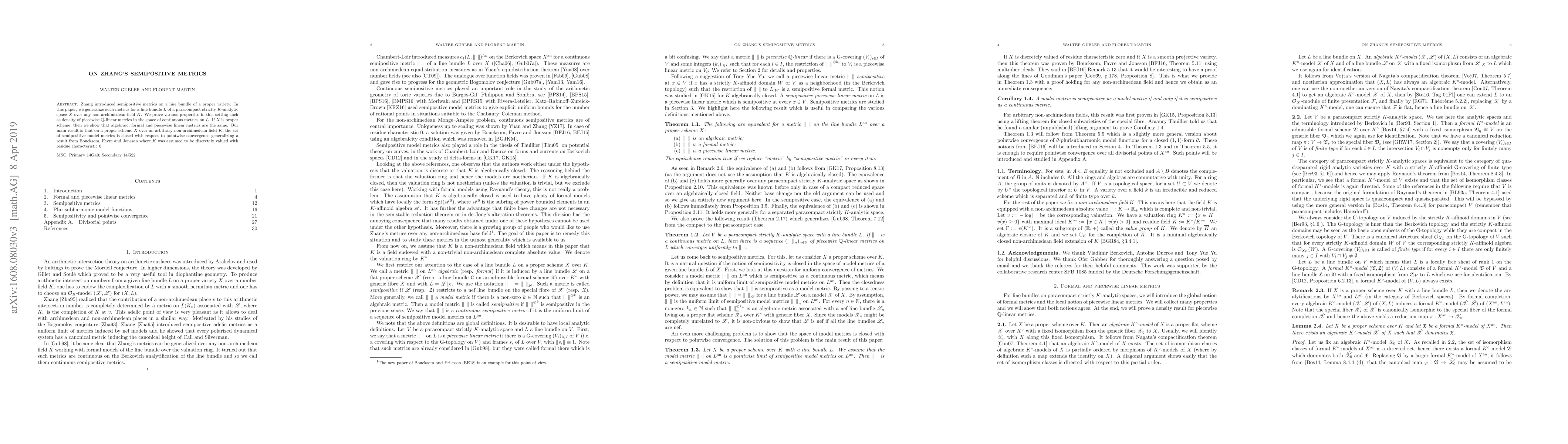 Zhang introduced semipositive metrics on a line bundle of a proper variety. In this paper, we generalize such metrics for a line bundle $L$ of a paracompact strictly $K$-analytic space $X$ over any non-archimedean field $K$. We prove various properties in this setting such as density of piecewise $\mathbb{Q}$-linear metrics in the space of continuous metrics on $L$. If $X$ is proper scheme, then we show that algebraic, formal and piecewise linear metrics are the same. Our main result is that on a proper scheme $X$ over an arbitrary non-archimedean field $K$, the set of semipositive model metrics is closed with respect to pointwise convergence generalizing a result from Boucksom, Favre and Jonsson where $K$ was assumed to be discretely valued with residue characteristic $0$.