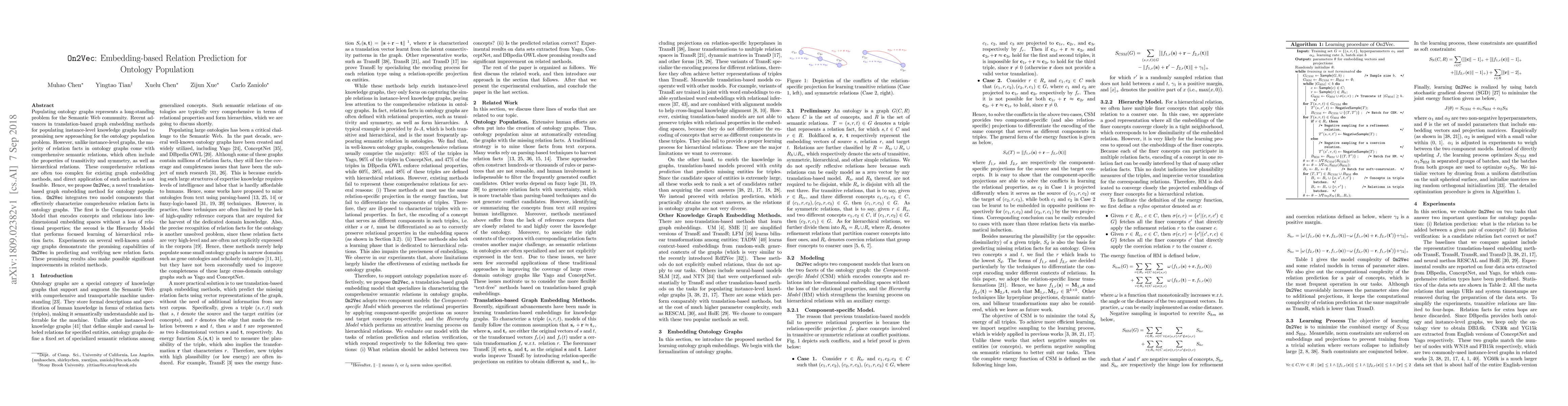 On2Vec introduces a novel translation-based graph embedding method for ontology population, addressing the complexity of comprehensive semantic relations in ontology graphs. The proposed model integrates a Component-specific Model and a Hierarchy Model to effectively predict and verify new relation facts, demonstrating significant improvements in ontology graph population.