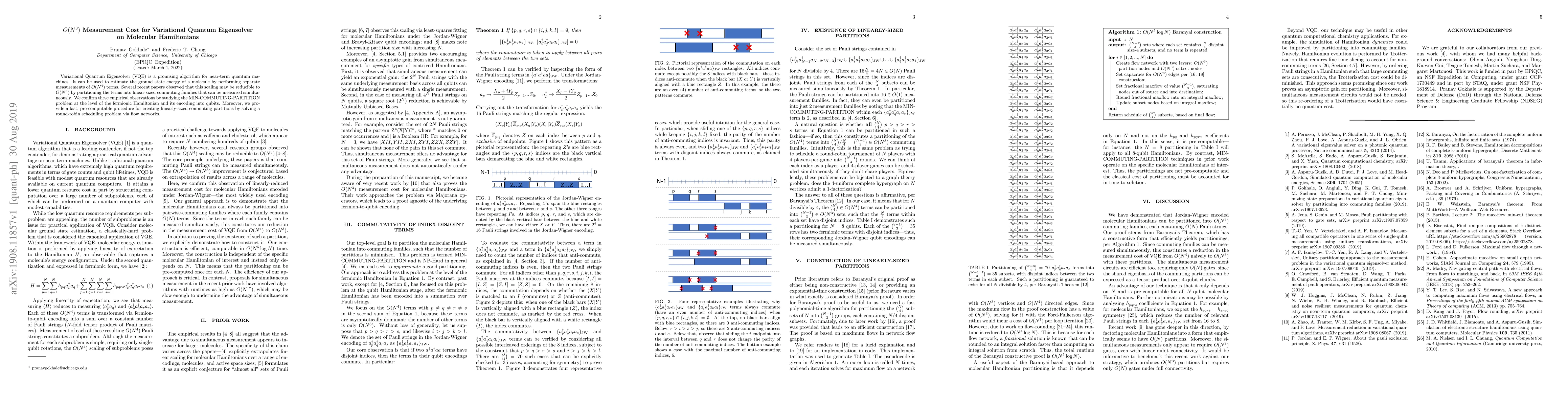 This paper confirms that the measurement cost for the Variational Quantum Eigensolver (VQE) can be reduced from $O(N^4)$ to $O(N^3)$ by partitioning terms into linearly-sized commuting families. It introduces a method to create these partitions efficiently using a round-robin scheduling problem solved via flow networks.