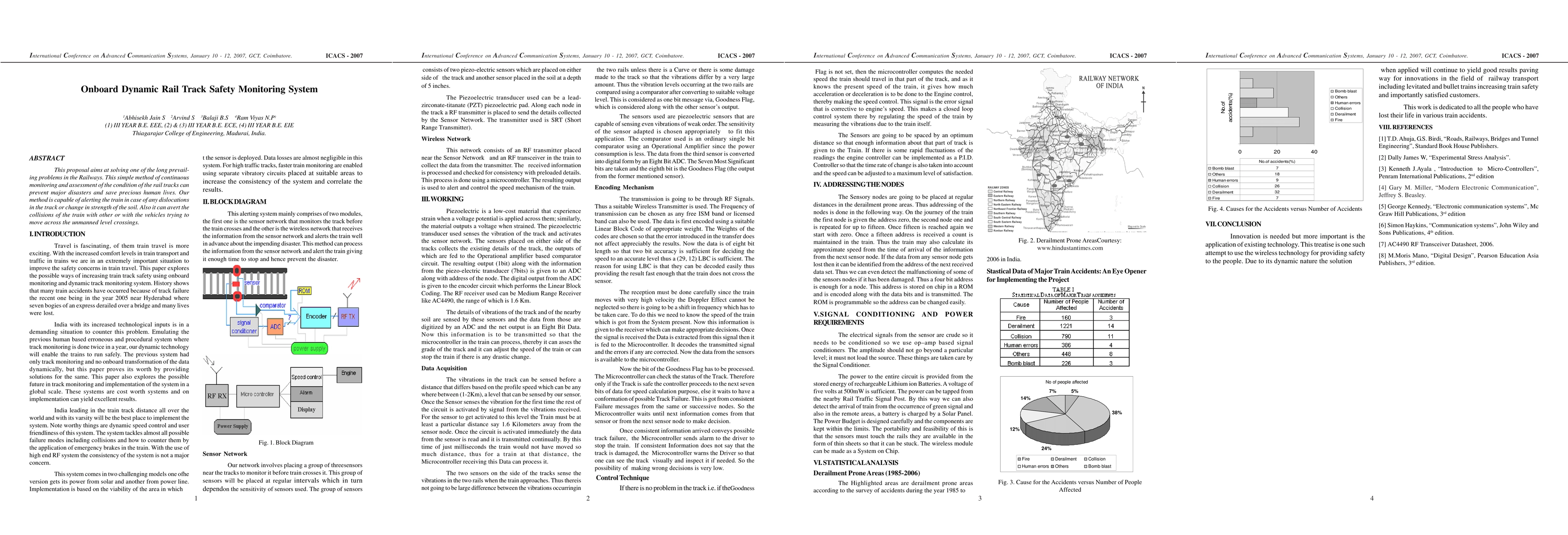 This proposal aims at solving one of the long prevailing problems in the Indian Railways. This simple method of continuous monitoring and assessment of the condition of the rail tracks can prevent major disasters and save precious human lives. Our method is capable of alerting the train in case of any dislocations in the track or change in strength of the soil. Also it can avert the collisions of the train with other or with the vehicles trying to move across the unmanned level crossings.