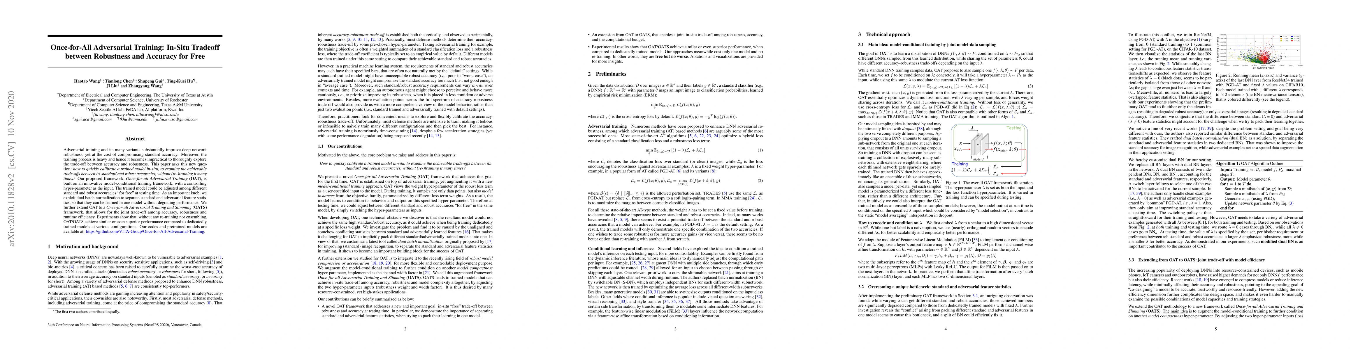 This paper proposes Once-for-All Adversarial Training (OAT) to quickly calibrate a trained model to explore the trade-off between standard and robust accuracy without re-training. It utilizes dual batch normalization to separate feature statistics and introduces OATS for joint optimization of accuracy, robustness, and efficiency. Experimental results show OAT/OATS achieve comparable or better performance than dedicatedly trained models.