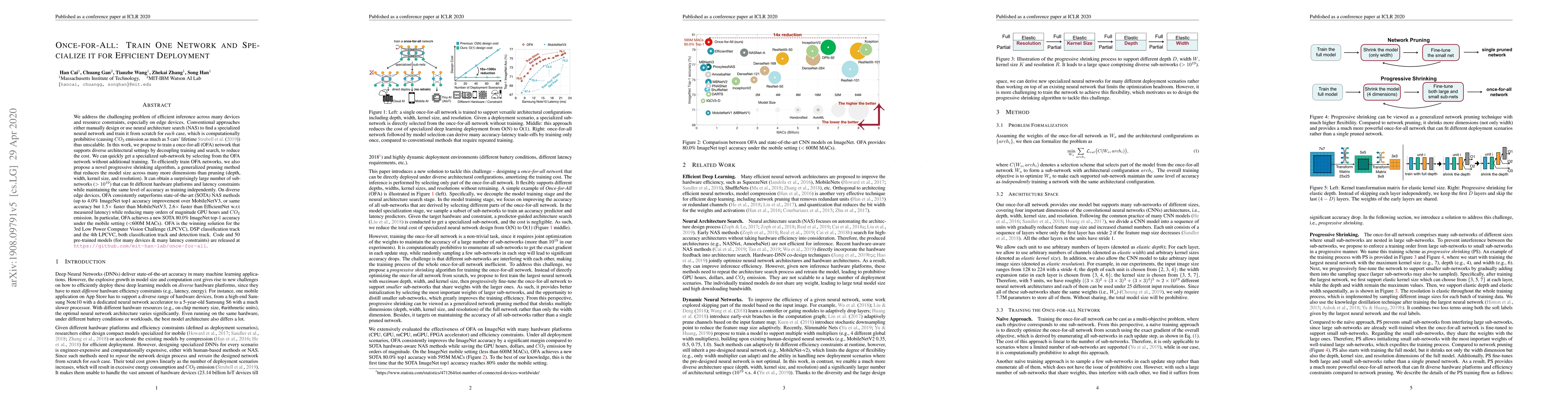 The paper proposes Once-for-All (OFA), a methodology that decouples model training from architecture search for efficient deep learning deployment across various hardware platforms. OFA supports diverse architectural configurations, including elastic depth, width, kernel size, and resolution, reducing training costs significantly compared to conventional methods.
