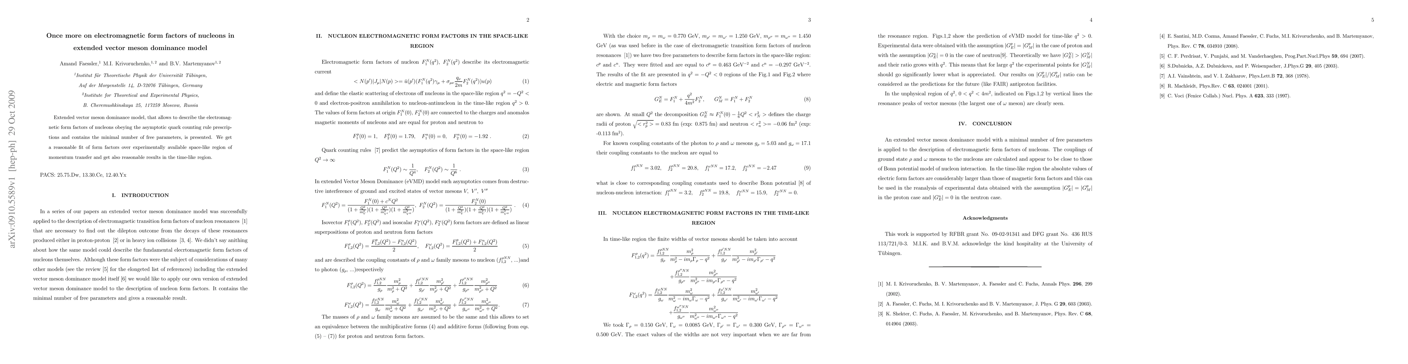 Extended vector meson dominance model, that allows to describe the electromagnetic form factors of nucleons obeying the asymptotic quark counting rule prescriptions and contains the minimal number of free parameters, is presented. We get a reasonable fit of form factors over experimentally available space-like region of momentum transfer and get also reasonable results in the time-like region.