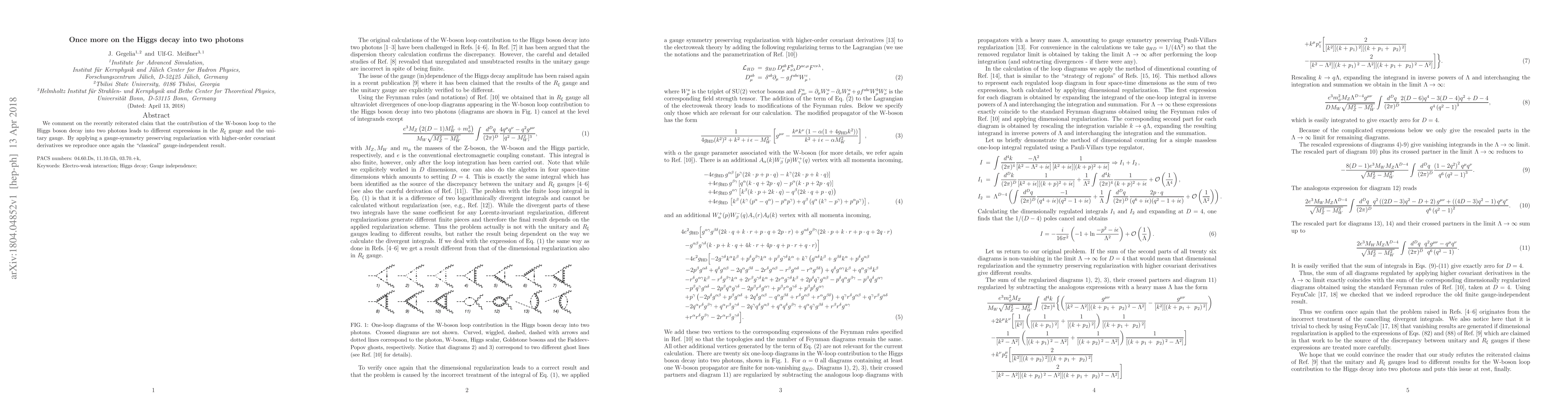 This paper revisits the Higgs decay into two photons, clarifying discrepancies in the W-boson loop contributions between $R_\xi$ and unitary gauges. It employs a gauge-symmetry preserving regularization method to reaffirm the traditional gauge-independent result.