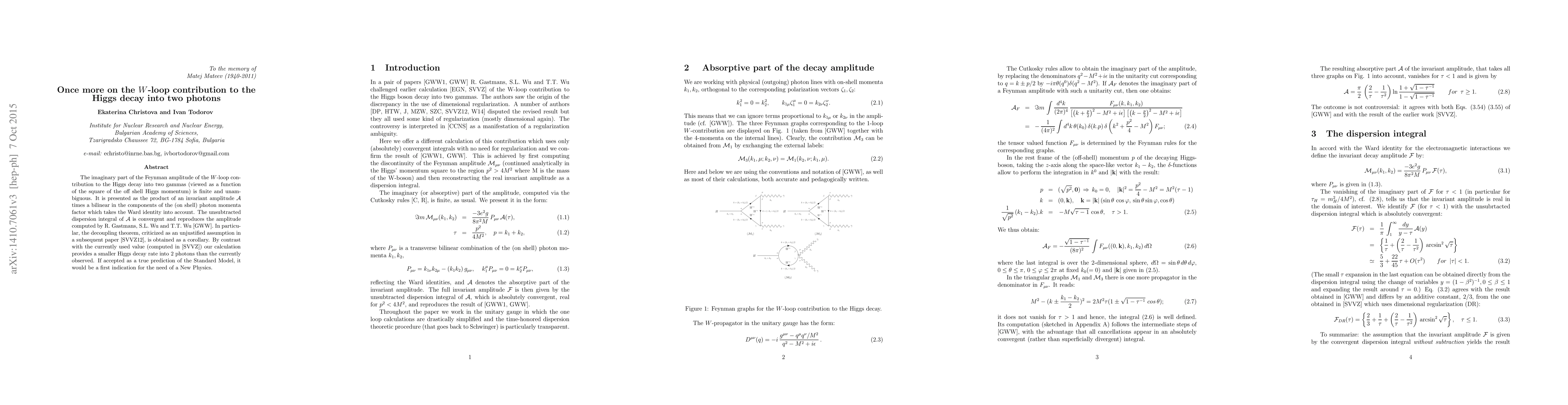 The imaginary part of the Feynman amplitude of the $W$-loop contribution to the Higgs decay into two gammas (viewed as a function of the square of the off shell Higgs momentum) is finite and unambiguous. It is presented as the product of an invariant amplitude ${\cal A}$ times a bilinear in the components of the (on shell) photon momenta factor which takes the Ward identity into account. The unsubtracted dispersion integral of ${\cal A}$ is convergent and reproduces the amplitude computed by R. Gastmans, S.L. Wu and T.T. Wu [GWW]. In particular, the decoupling theorem, criticized as an unjustified assumption in a subsequent paper [SVVZ12], is obtained as a corollary. By contrast with the currently used value (computed in [SVVZ]) our calculation provides a smaller Higgs decay rate into 2 photons than the currently observed. If accepted as a true prediction of the Standard Model, it would be a first indication for the need of a New Physics.