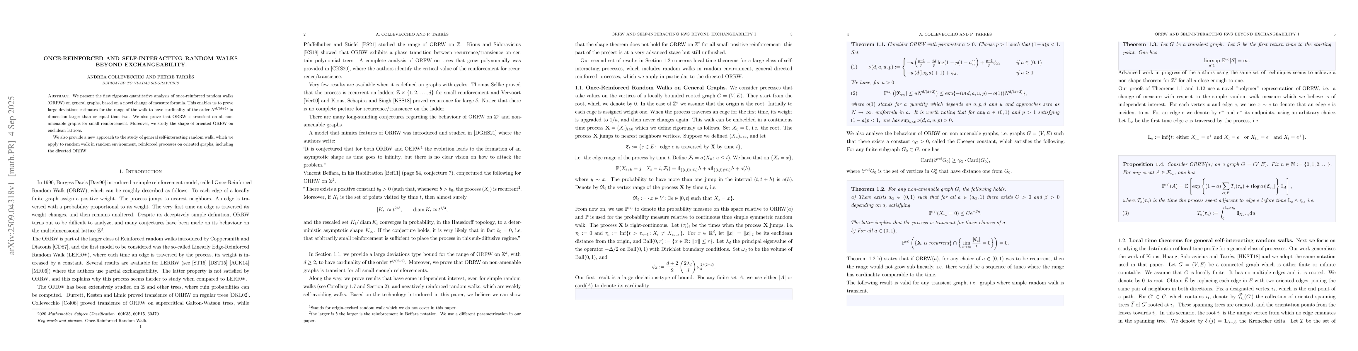 We present the first rigorous quantitative analysis of once-reinforced random walks (ORRW) on general graphs, based on a novel change of measure formula.~This enables us to prove large deviations estimates for the range of the walk to have cardinality of the order $N^{d/(d+2)}$ in dimension larger than or equal than two. We also prove that ORRW is transient on all non-amenable graphs for small reinforcement.~Moreover, we study the shape of oriented ORRW on euclidean lattices. We also provide a new approach to the study of general self-interacting random walk, which we apply to random walk in random environment, reinforced processes on oriented graphs, including the directed ORRW.