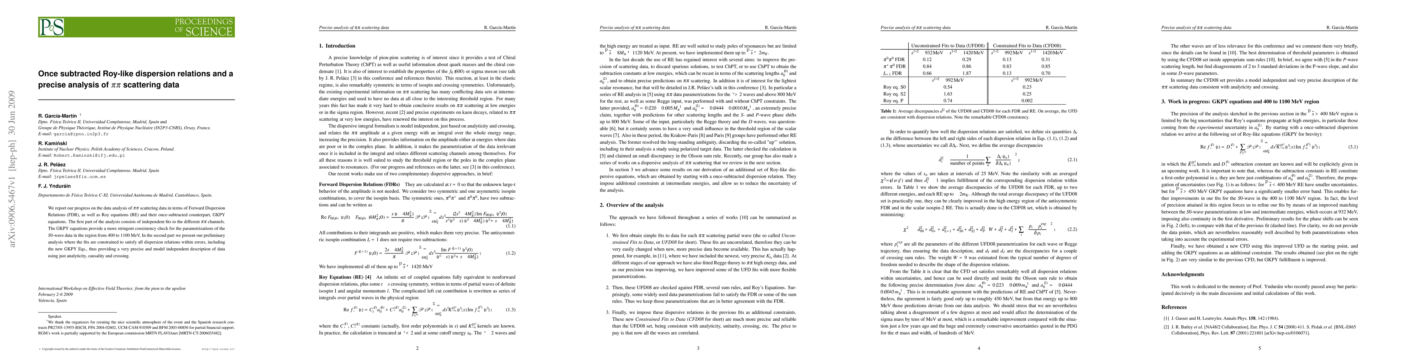 We report our progress on the data analysis of $\pi\pi$ scattering data in terms of Forward Dispersion Relations (FDR), as well as Roy equations (RE) and their once-subtracted counterpart, GKPY equations. The first part of the analysis consists of independent fits to the different $\pi\pi$ channels. The GKPY equations provide a more stringent consistency check for the parametrizations of the S0-wave data in the region from 400 to 1100 MeV, In the second part we present our preliminary analysis where the fits are constrained to satisfy all dispersion relations within errors, including the new GKPY Eqs., thus providing a very precise and model independent description of data using just analyticity, causality and crossing.
