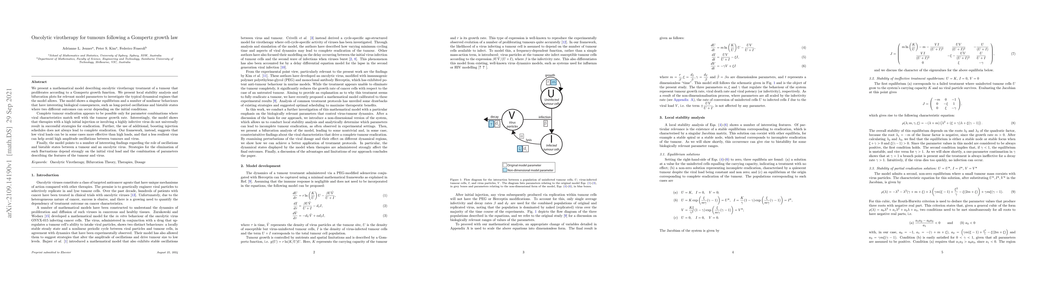 This paper develops a mathematical model for oncolytic virotherapy against tumours following a Gompertz growth law, revealing complex dynamics including long-period oscillations and bistable states. It finds that low viral loads and less resilient viruses may be more effective than high viral loads, challenging conventional therapy strategies.
