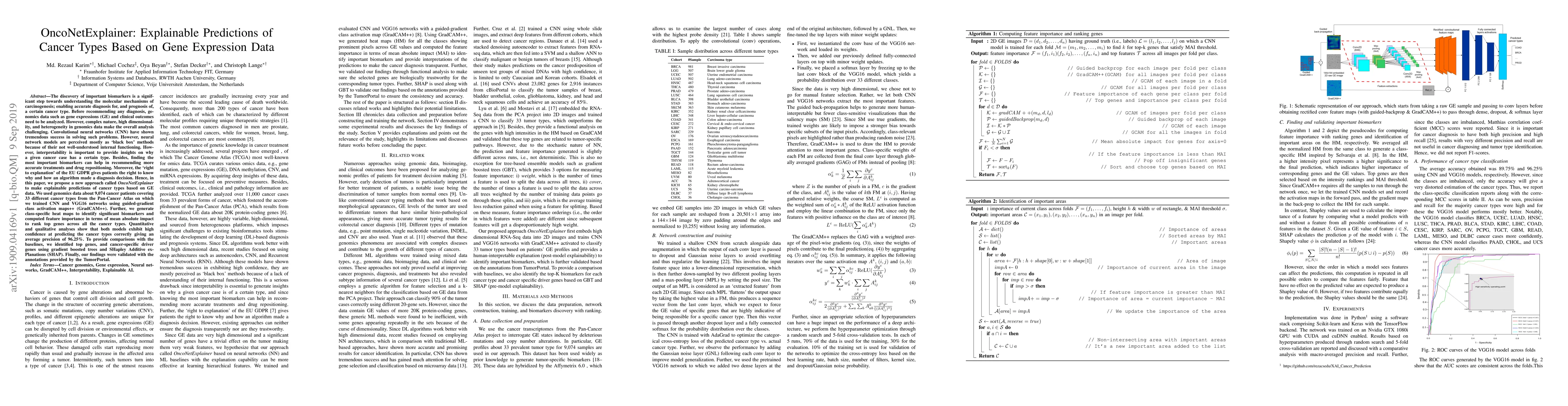 The discovery of important biomarkers is a significant step towards understanding the molecular mechanisms of carcinogenesis; enabling accurate diagnosis for, and prognosis of, a certain cancer type. Before recommending any diagnosis, genomics data such as gene expressions(GE) and clinical outcomes need to be analyzed. However, complex nature, high dimensionality, and heterogeneity in genomics data make the overall analysis challenging. Convolutional neural networks(CNN) have shown tremendous success in solving such problems. However, neural network models are perceived mostly as `black box' methods because of their not well-understood internal functioning. However, interpretability is important to provide insights on why a given cancer case has a certain type. Besides, finding the most important biomarkers can help in recommending more accurate treatments and drug repositioning. In this paper, we propose a new approach called OncoNetExplainer to make explainable predictions of cancer types based on GE data. We used genomics data about 9,074 cancer patients covering 33 different cancer types from the Pan-Cancer Atlas on which we trained CNN and VGG16 networks using guided-gradient class activation maps++(GradCAM++). Further, we generate class-specific heat maps to identify significant biomarkers and computed feature importance in terms of mean absolute impact to rank top genes across all the cancer types. Quantitative and qualitative analyses show that both models exhibit high confidence at predicting the cancer types correctly giving an average precision of 96.25%. To provide comparisons with the baselines, we identified top genes, and cancer-specific driver genes using gradient boosted trees and SHapley Additive exPlanations(SHAP). Finally, our findings were validated with the annotations provided by the TumorPortal.