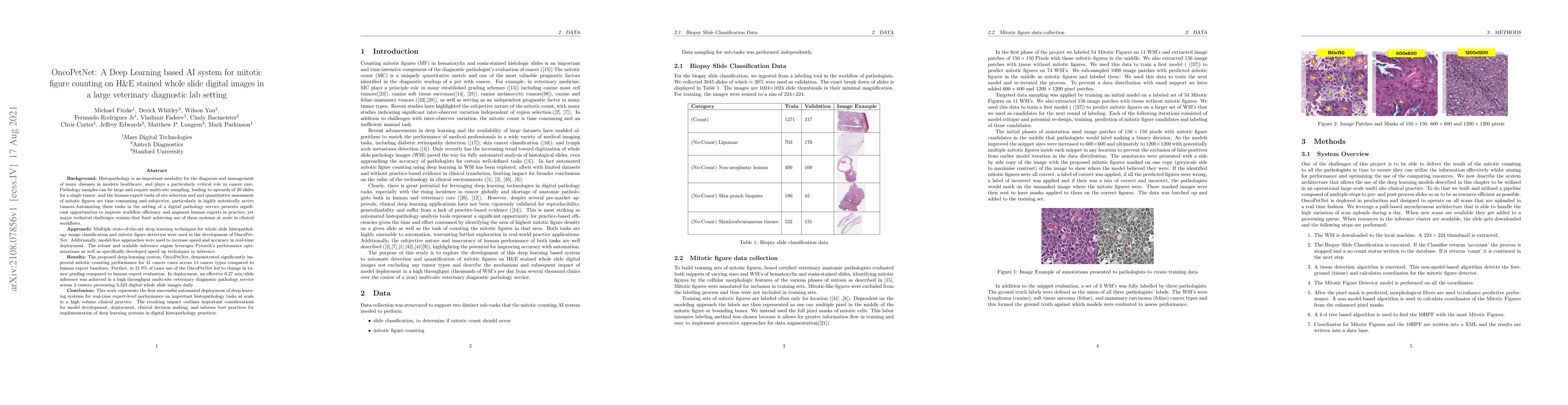 OncoPetNet, a deep learning system for mitotic figure counting in H&E stained digital pathology images, significantly outperforms human experts in efficiency and accuracy, leading to changes in tumor grading in 21.9% of cases. Deployed in a high-volume veterinary diagnostic lab, it achieves 0.27 min/slide inference speed, demonstrating scalable real-time expert-level performance.