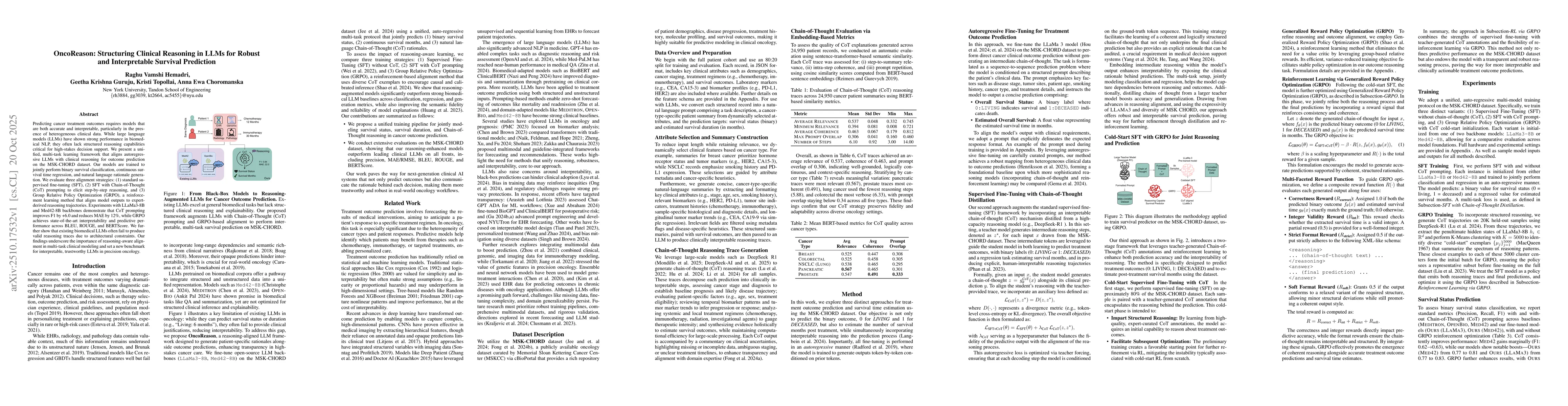 The research employs a generalized reward policy optimization (GRPO) framework integrated with chain-of-thought (CoT) reasoning to enhance cancer treatment outcome predictions using the MSK-CHORD dataset. The methodology combines structured clinical data with large language models (LLMs) to generate interpretable reasoning traces for survival analysis.