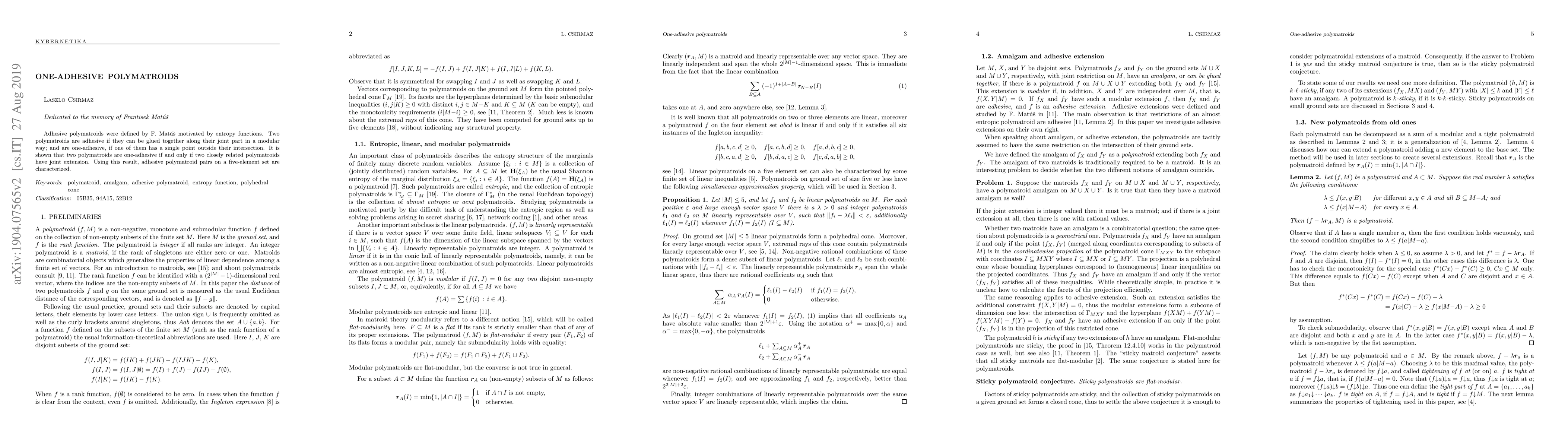 Summary: The paper explores adhesive polymatroids, defining one-adhesive pairs as those that can be glued together along a shared part, with one having a single point outside their intersection. It proves that one-adhesiveness is equivalent to the existence of any extension of related polymatroids, and characterizes adhesive pairs on a five-element set.