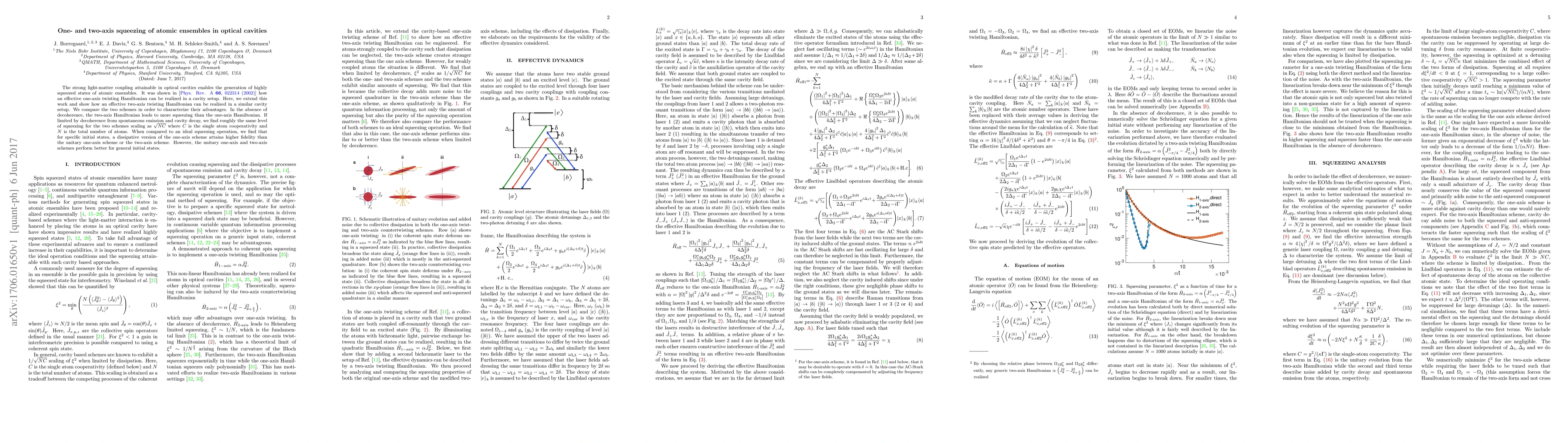 This paper investigates the generation of squeezed states in optical cavities using one- and two-axis twisting Hamiltonians. It finds that while the two-axis scheme provides more squeezing in ideal conditions, both schemes achieve similar levels of squeezing under decoherence. The dissipative one-axis scheme shows higher fidelity for specific initial states, whereas the unitary schemes perform better for general initial states.