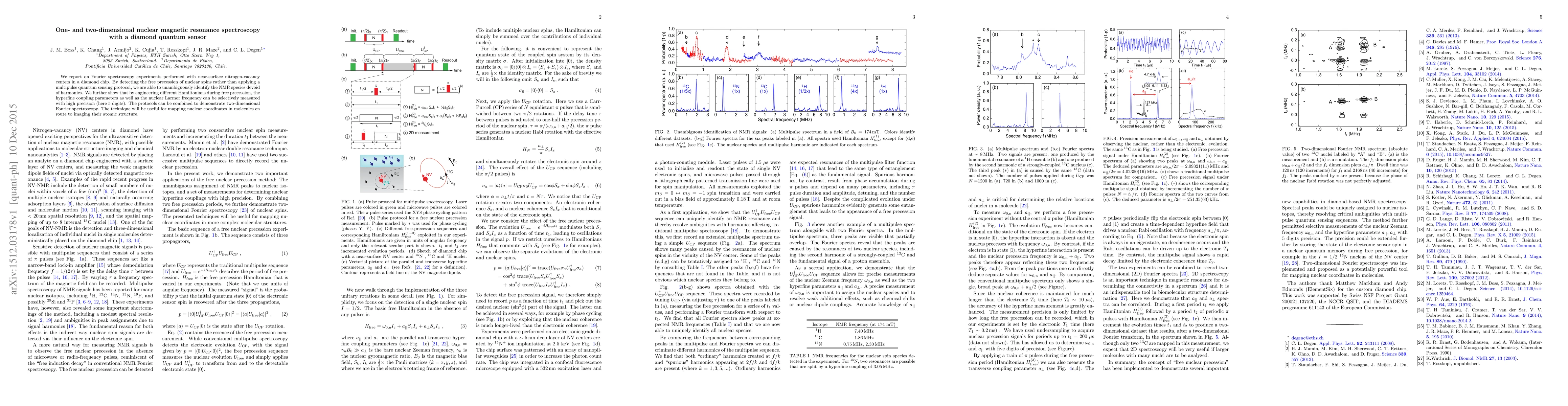 We report on Fourier spectroscopy experiments performed with near-surface nitrogen-vacancy centers in a diamond chip. By detecting the free precession of nuclear spins rather than applying a multipulse quantum sensing protocol, we are able to unambiguously identify the NMR species devoid of harmonics. We further show that by engineering different Hamiltonians during free precession, the hyperfine coupling parameters as well as the nuclear Larmor frequency can be selectively measured with high precision (here 5 digits). The protocols can be combined to demonstrate two-dimensional Fourier spectroscopy. The technique will be useful for mapping nuclear coordinates in molecules en route to imaging their atomic structure.