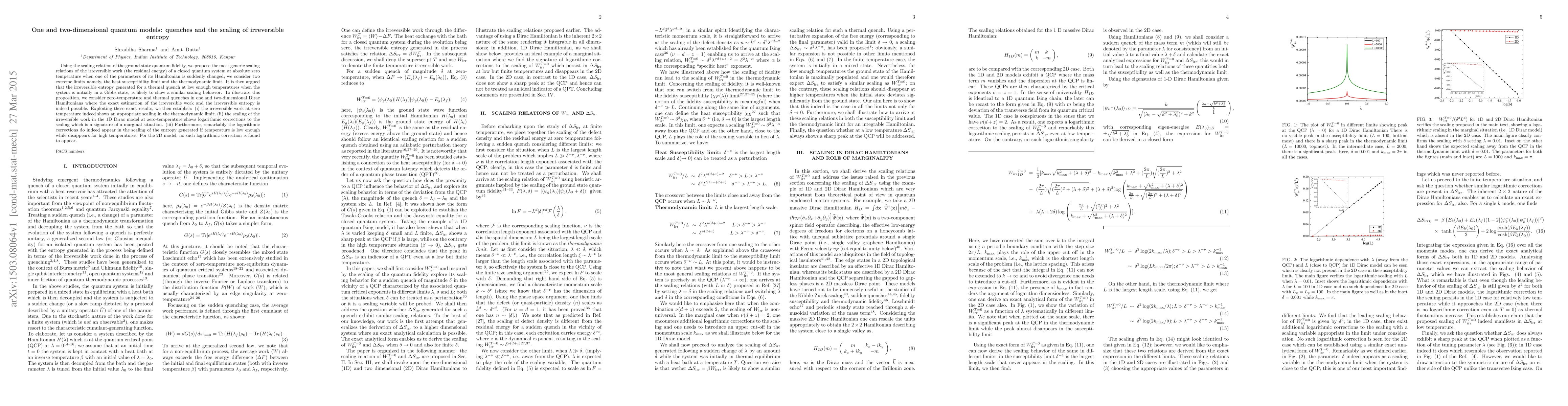This research proposes scaling relations for irreversible work in quantum systems with sudden parameter changes, illustrated using one and two-dimensional Dirac Hamiltonians. Key findings include appropriate scaling in the thermodynamic limit at zero temperature, logarithmic corrections in the 1D model signaling a marginal situation, and temperature-dependent logarithmic corrections in entropy generation. No such corrections are found in the 2D model.