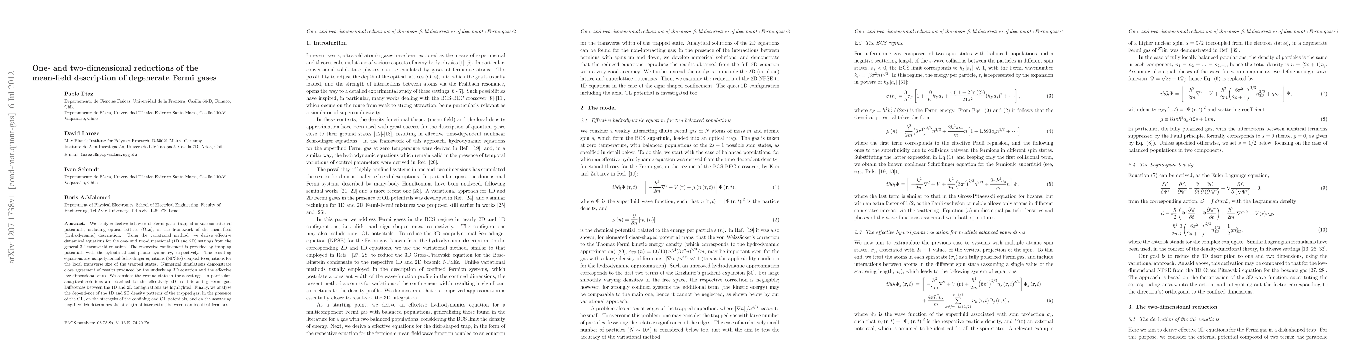 We study collective behavior of Fermi gases trapped in various external potentials, including optical lattices (OLs), in the framework of the mean-field (hydrodynamic) description. Using the variational method, we derive effective dynamical equations for the one- and two-dimensional (1D and 2D) settings from the general 3D mean-field equation. The respective confinement is provided by trapping potentials with the cylindrical and planar symmetry, respectively. The resulting equations are nonpolynomial Schr% \"{o}dinger equations (NPSEs) coupled to equations for the local transverse size of the trapped states. Numerical simulations demonstrate close agreement of results produced by the underlying 3D equation and the effective low-dimensional ones. We consider the ground state in these settings. In particular, analytical solutions are obtained for the effectively 2D non-interacting Fermi gas. Differences between the 1D and 2D configurations are highlighted. Finally, we analyze the dependence of the 1D and 2D density patterns of the trapped gas, in the presence of the OL, on the strengths of the confining and OL potentials, and on the scattering length which determines the strength of interactions between non-identical fermions.