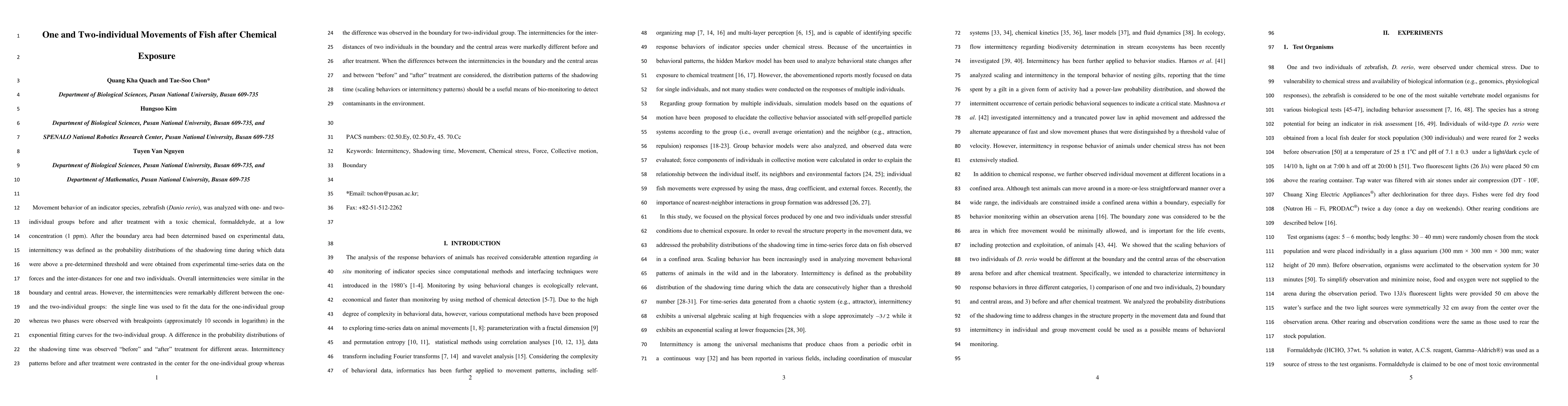 Movement behavior of an indicator species, zebrafish (Danio rerio), was analyzed with one- and two-individual groups before and after treatment with a toxic chemical, formaldehyde, at a low concentration (1 ppm). After the boundary area had been determined based on experimental data, intermittency was defined as the probability distributions of the shadowing time during which data were above a pre-determined threshold and were obtained from experimental time-series data on forces and the inter-distances for one and two individuals. Overall intermittencies were similar in the boundary and central areas. However, the intermittencies were remarkably different between the one- and the two-individual groups: the single line was used to fit the data for the one-individual group whereas two phases were observed with breakpoints (approximately 10 seconds in logarithm) in the exponential fitting curves for the two-individual group. A difference in the probability distributions of shadowing time was observed "before" and "after" treatment for different areas. Intermittency patterns before and after treatment were contrasted in the center for the one-individual group whereas the difference was observed in the boundary for two-individual group. The intermittencies for the inter-distances of two individuals in the boundary and central areas were markedly different before and after treatment. When the differences between the intermittencies in the boundary and the central areas and between "before" and "after" treatment are considered, the distribution patterns of the shadowing time (scaling behaviors or intermittency patterns) should be a useful means of bio-monitoring to detect contaminants in the environment.