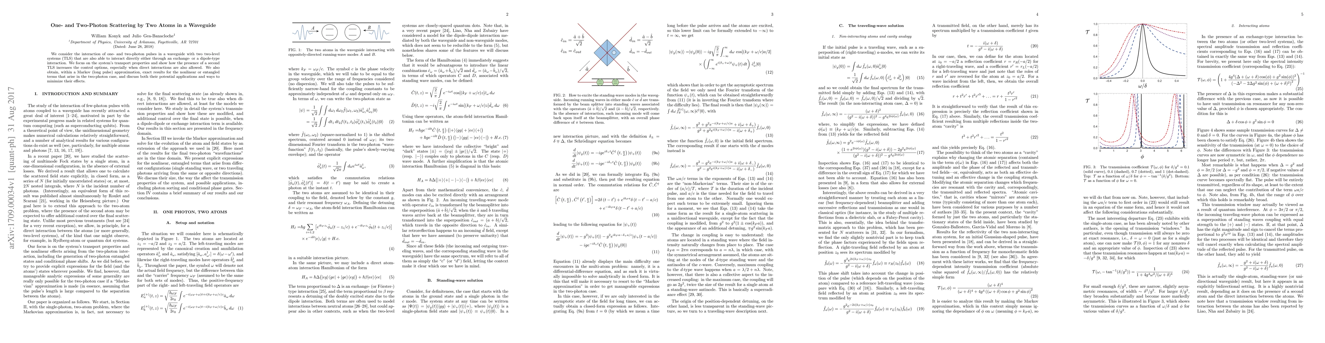 We consider the interaction of one- and two-photon pulses in a waveguide with two two-level systems (TLS) that are also able to interact directly either through an exchange- or a dipole-type interaction. We focus on the system's transport properties and show how the presence of a second TLS increases the control options, especially when direct interactions are also allowed. We also obtain, within a Markov (long pulse) approximation, exact results for the nonlinear or entangled terms that arise in the two-photon case, and discuss both their potential applications and ways to minimize their effects.
