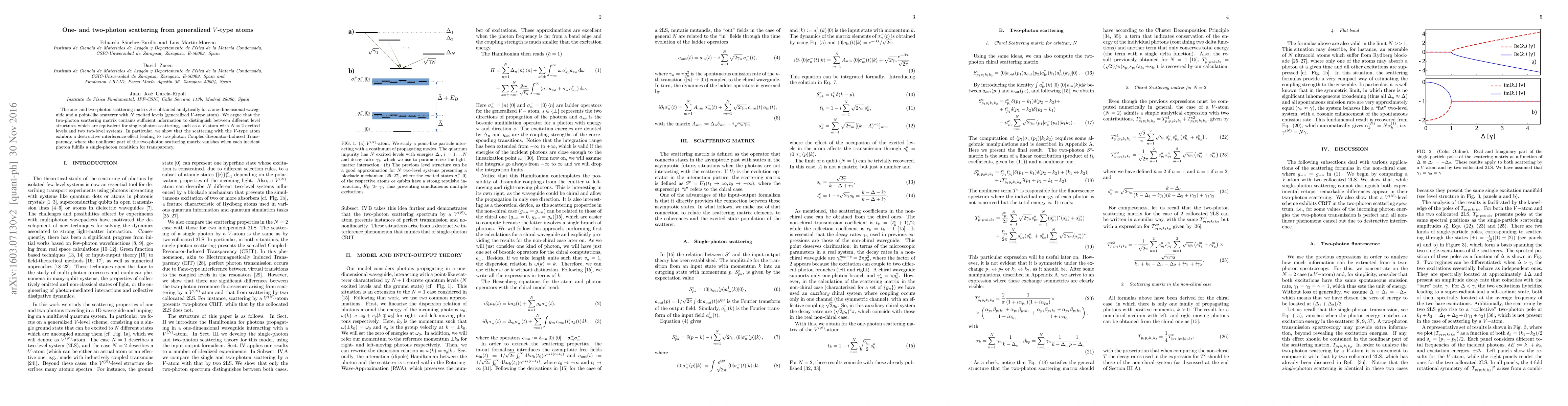 The one- and two-photon scattering matrix S is obtained analytically for a one-dimensional waveguide and a point-like scatterer with N excited levels (generalized V -type atom). We argue that the two-photon scattering matrix contains sufficient information to distinguish between different level structures which are equivalent for single-photon scattering, such as a V -atom with N = 2 excited levels and two two-level systems. In particular, we show that the scattering with the V -type atom exhibits a destructive interference effect leading to two-photon Coupled-Resonator-Induced Transparency, where the nonlinear part of the two-photon scattering matrix vanishes when each incident photon fulfills a single-photon condition for transparency.