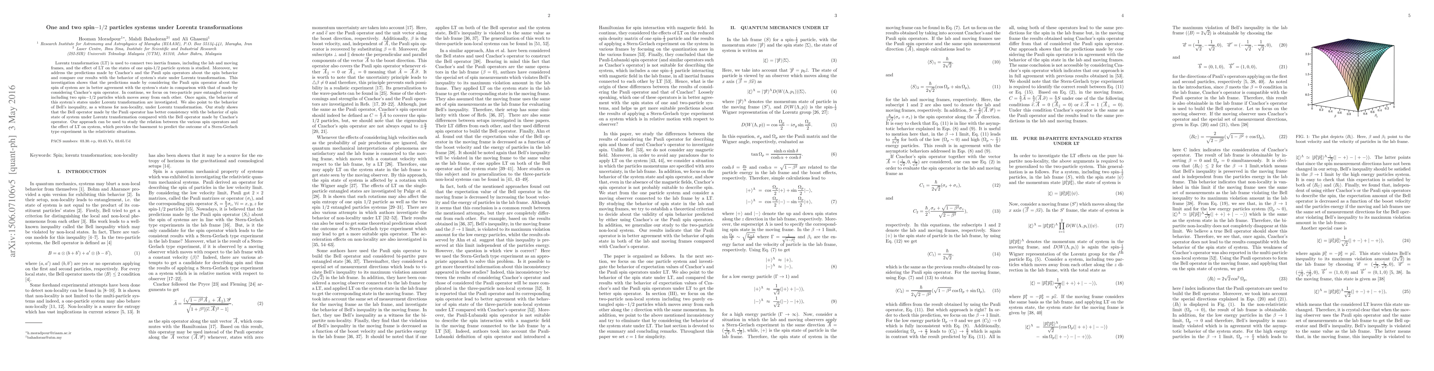 This paper investigates the effects of Lorentz transformations on spin-1/2 particle systems, comparing predictions made by Pauli and Czachor's spin operators. It finds that Pauli's operator provides better consistency with the relativistic spin behavior, especially in entangled two-particle systems, and highlights the relevance of Bell's inequality under Lorentz transformations.