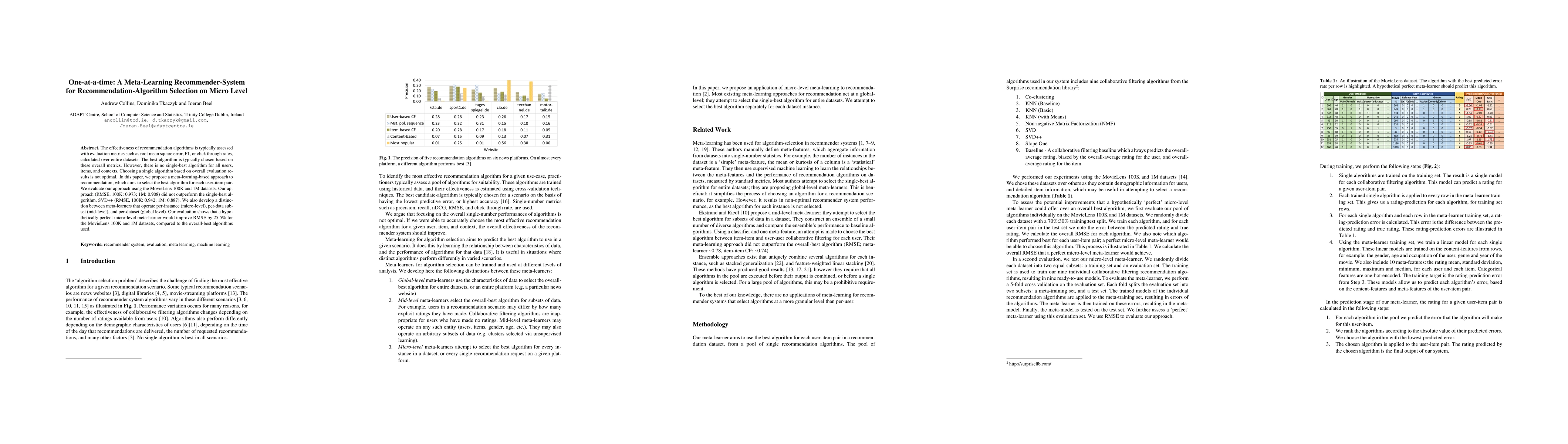 This paper proposes a meta-learning recommender system to select the best algorithm for each user-item pair rather than relying on a single best algorithm for all contexts. The approach did not outperform the best single algorithm but suggests that a perfect micro-level meta-learner could improve RMSE by 25.5% on the MovieLens datasets.
