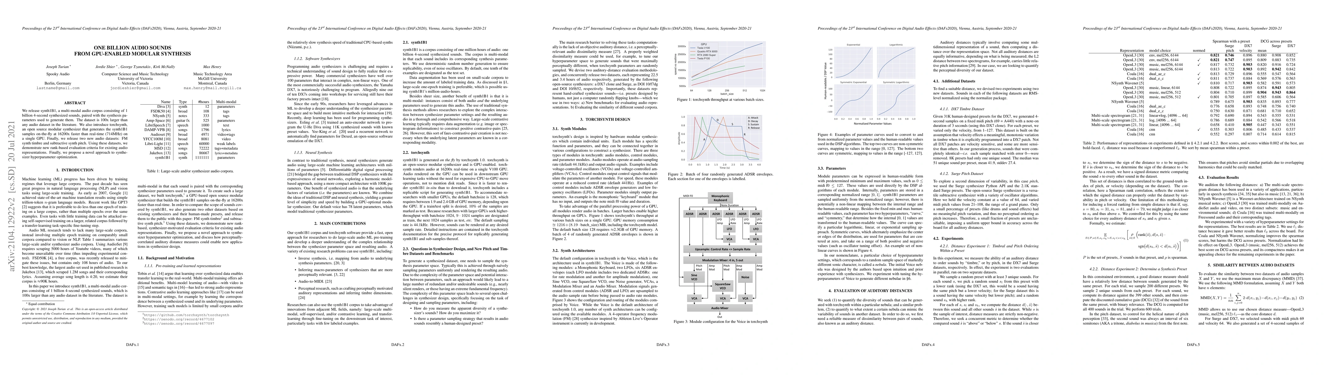 This paper presents synth1B1, a massive audio corpus of 1 billion 4-second synthesized sounds, along with synthesis parameters. It also introduces torchsynth, a GPU-powered modular synthesizer generating samples 100 times faster than real-time. Two new audio datasets, FM synth timbre and subtractive synth pitch, are released for evaluating audio representations, and a novel approach for synthesizer hyperparameter optimization is proposed.
