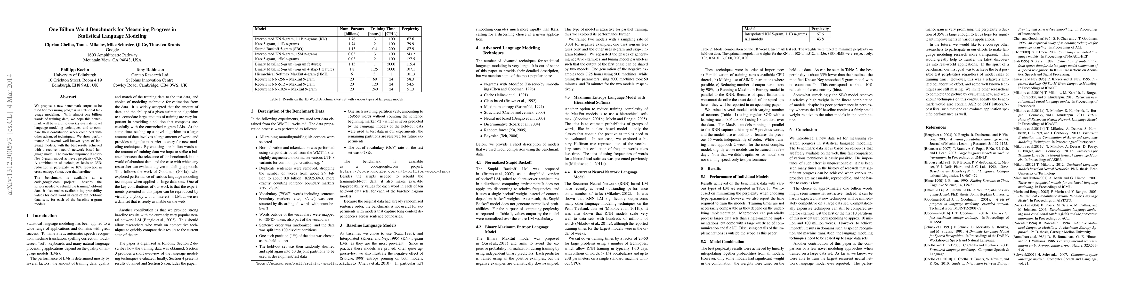 We propose a new benchmark corpus to be used for measuring progress in statistical language modeling. With almost one billion words of training data, we hope this benchmark will be useful to quickly evaluate novel language modeling techniques, and to compare their contribution when combined with other advanced techniques. We show performance of several well-known types of language models, with the best results achieved with a recurrent neural network based language model. The baseline unpruned Kneser-Ney 5-gram model achieves perplexity 67.6; a combination of techniques leads to 35% reduction in perplexity, or 10% reduction in cross-entropy (bits), over that baseline. The benchmark is available as a code.google.com project; besides the scripts needed to rebuild the training/held-out data, it also makes available log-probability values for each word in each of ten held-out data sets, for each of the baseline n-gram models.