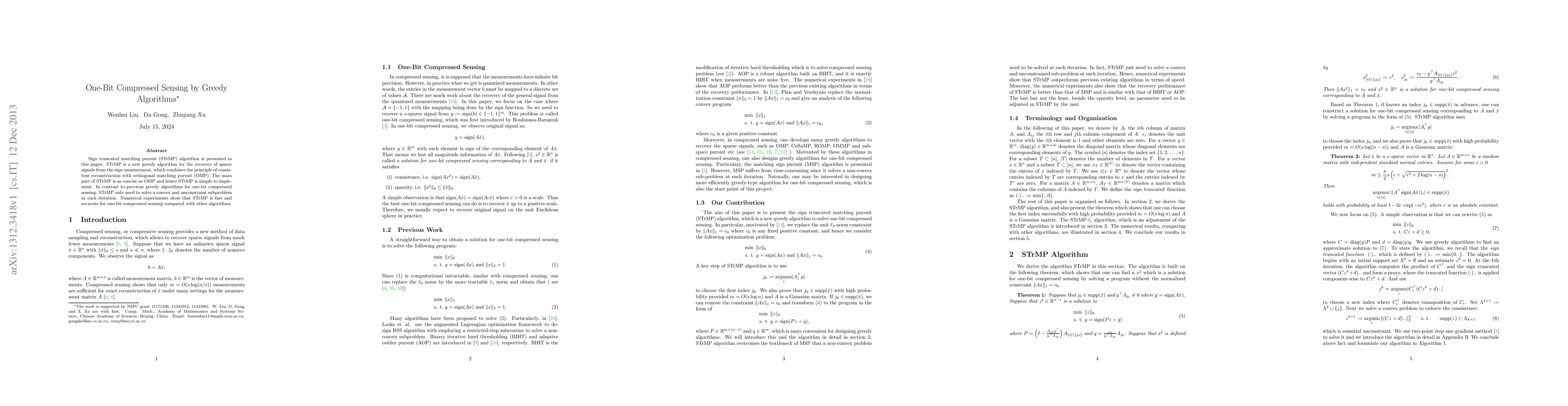 This paper introduces the Sign truncated matching pursuit (STrMP) algorithm, a new greedy method for recovering sparse signals from sign measurements. STrMP combines consistent reconstruction with orthogonal matching pursuit, offering simplicity and efficiency, and outperforms other one-bit compressed sensing algorithms in both speed and accuracy.