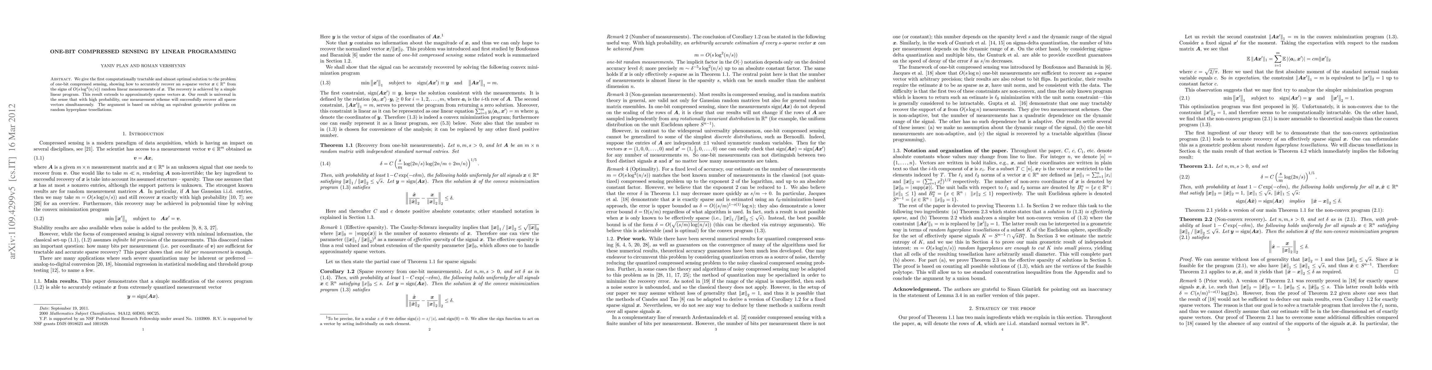 Researchers have developed a method to recover sparse vectors from one-bit measurements using linear programming, achieving almost optimal accuracy with high probability. This breakthrough has implications for compressed sensing applications in various fields.