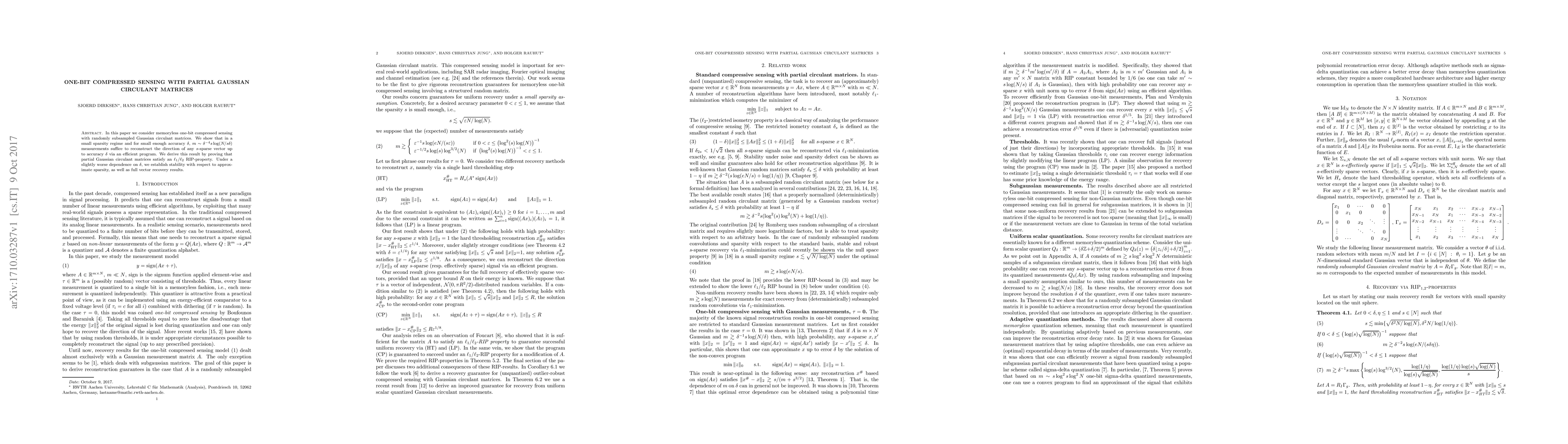 This paper explores one-bit compressed sensing using randomly subsampled Gaussian circulant matrices, demonstrating that $m \sim \delta^{-4} s \log(N/s\delta)$ measurements are sufficient for reconstructing sparse vector directions up to accuracy $\delta$. The authors prove the $\ell_1/\ell_2$ RIP-property for partial Gaussian circulant matrices to achieve this result.