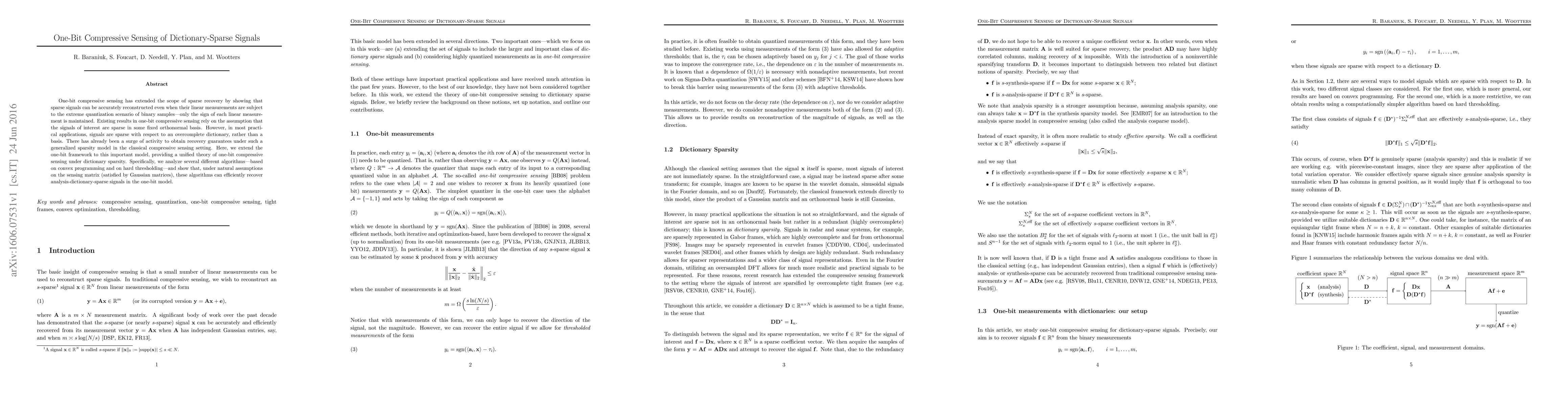 The paper extends the one-bit compressive sensing framework to signals that are sparse with respect to an overcomplete dictionary, providing recovery guarantees for several algorithms under natural assumptions on the sensing matrix.