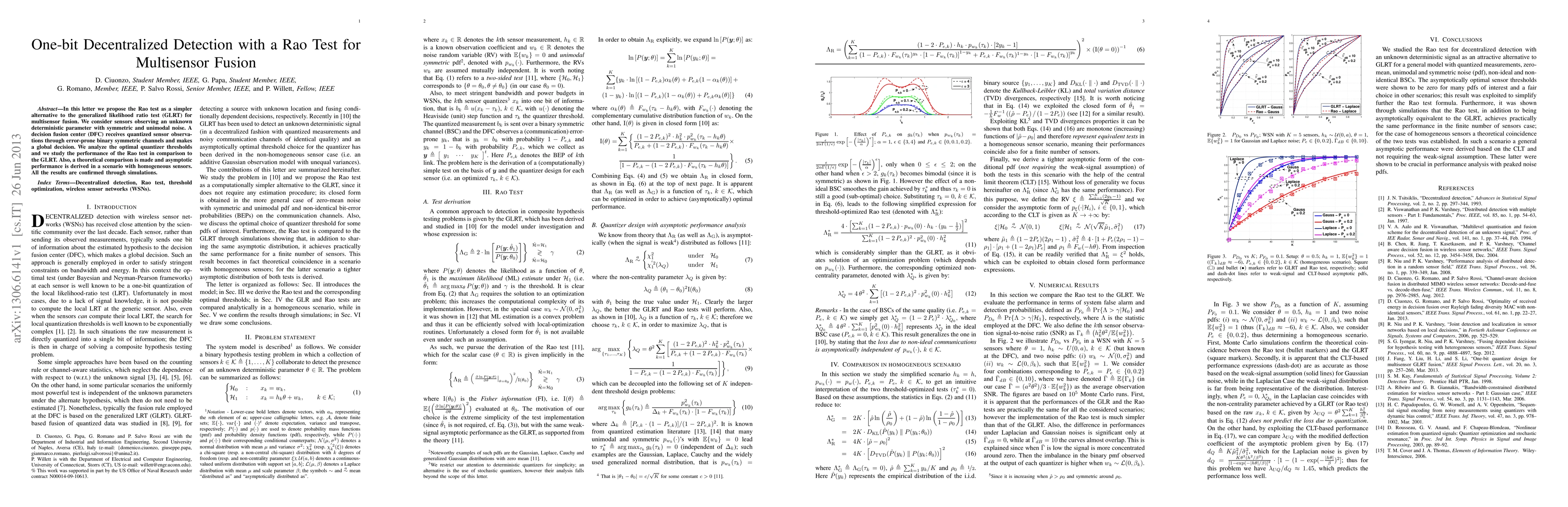 This paper proposes the Rao test as a simpler alternative to the GLRT for multisensor fusion, analyzing optimal quantizer thresholds and comparing its performance to the GLRT, with results confirmed through simulations. The study focuses on symmetric and unimodal noise in sensors and quantizes observations through error-prone channels for a decision fusion center.